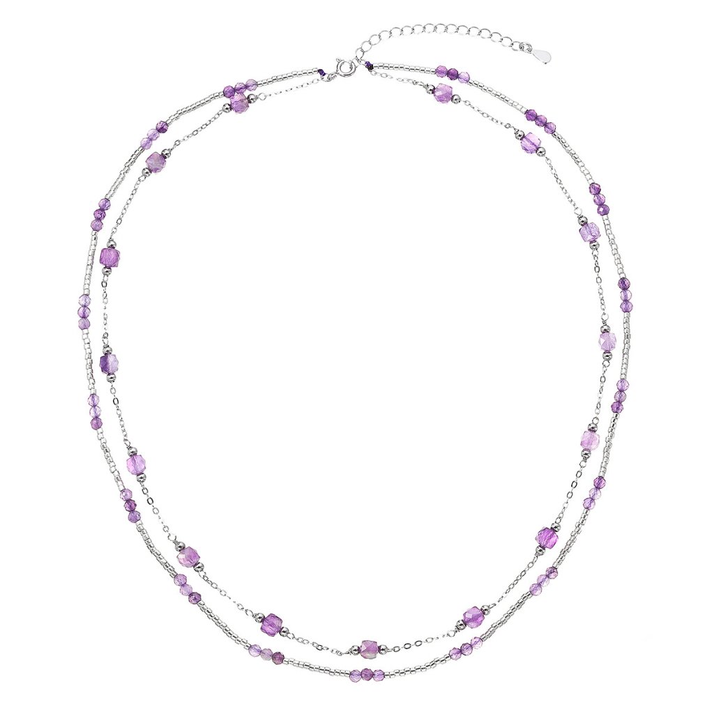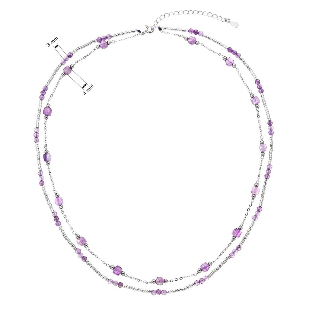 Očarujúce jemný dvojradový náhrdelník s drobnými prírodnými kamienkami ametystmi pôsobí ľahko a elegantne.