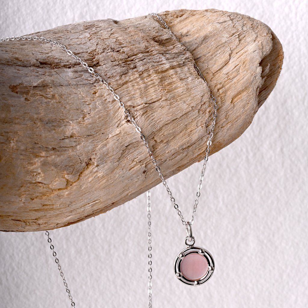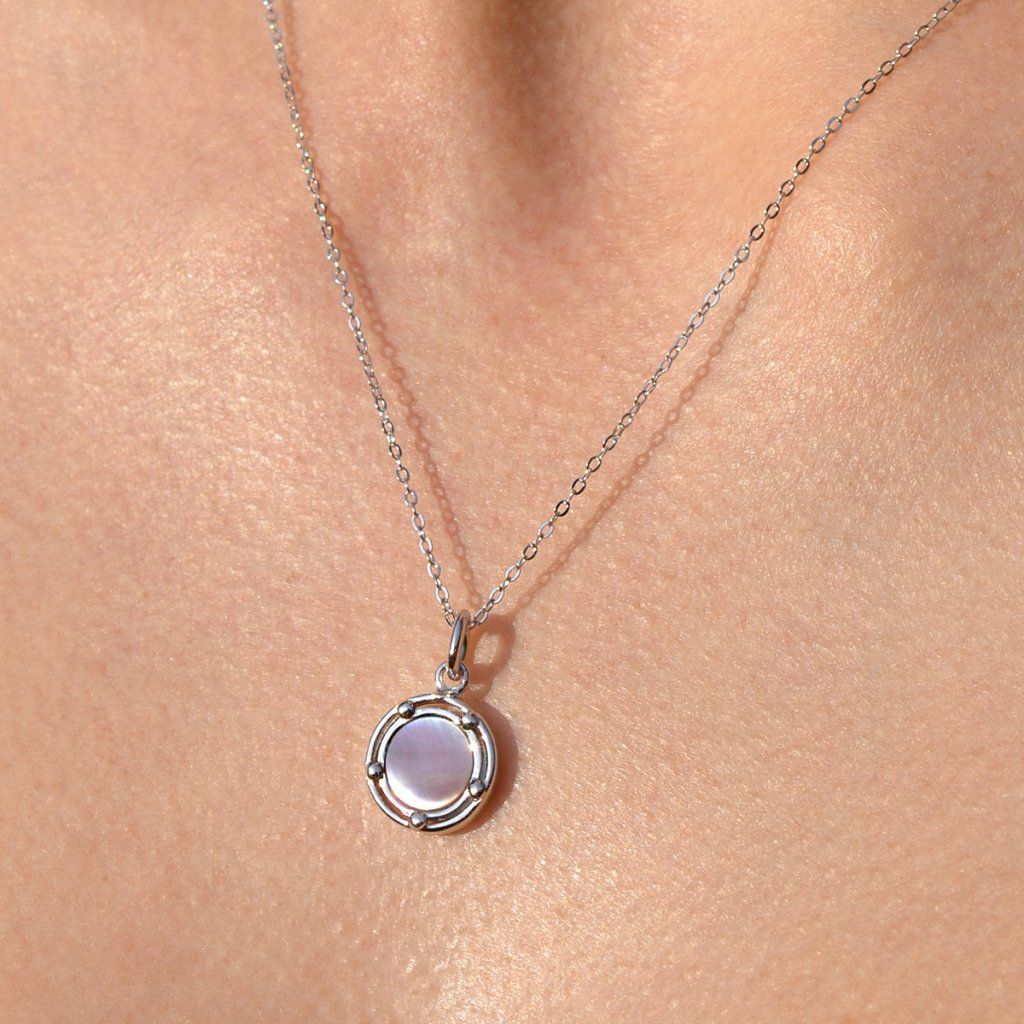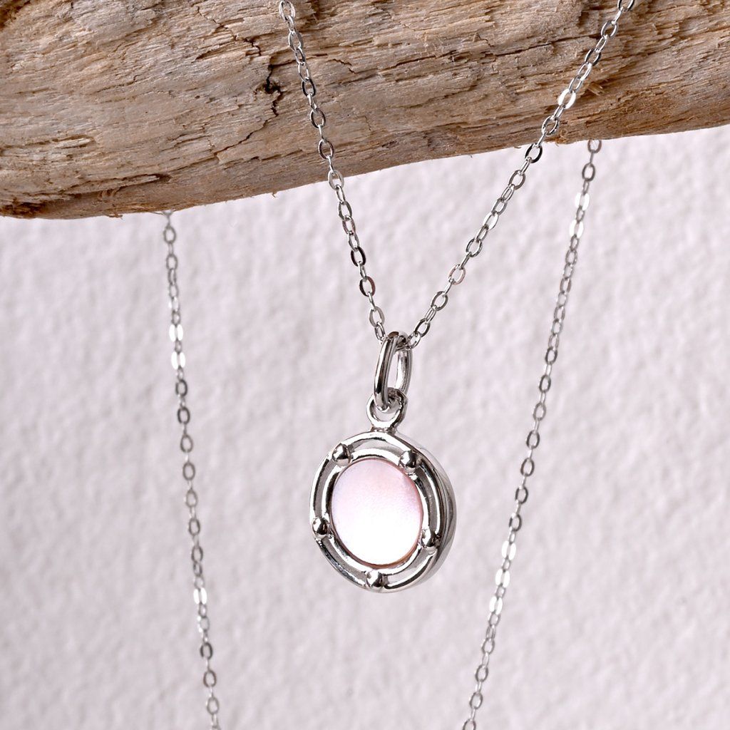 Náhrdelník s príveskom je vytvorený zo striebra rýdzosti 925/1000 s ródiovou úpravou, ktorá poskytuje šperku maximálnu ochranu pred poškriabaním, zožltnutím aj sčernením. Precízne zasadená jemne ružová perleť je nežne obomknutá pozláteným striebrom, čím vytvára dokonalú harmóniu farieb a tvarov. Okrúhly prívesok s perleťou zachytáva premenlivosť svetla - pri každom pohybe hrá jemnými farbami, ktoré očarujú svojou krehkou krásou.