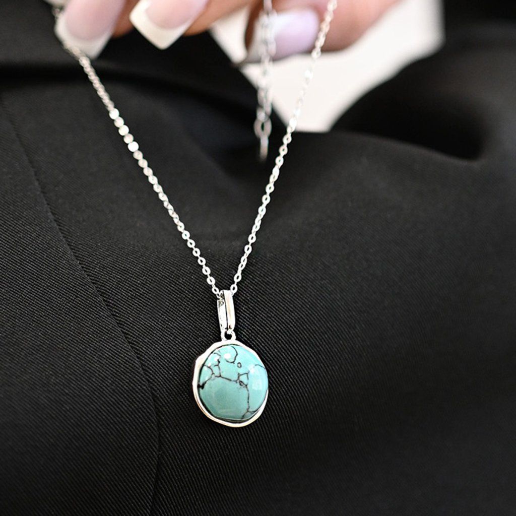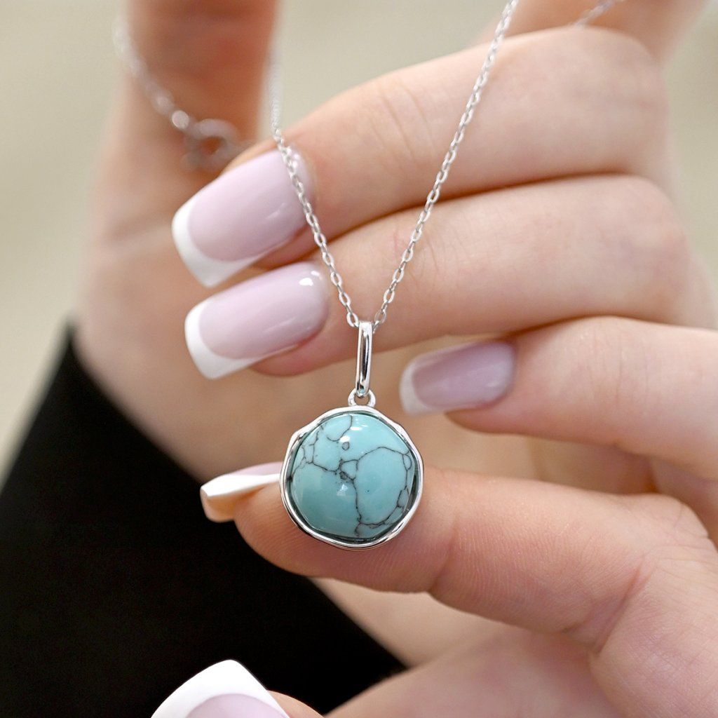 Náhrdelník s príveskom je vytvorený zo striebra rýdzosti 925/1000 s rhodiovanou úpravou, ktorá poskytuje šperku maximálnu ochranu a čistý, žiarivý lesk. Precízne zasadený prírodný tyrkys v charakteristickej modrozelenej farbe zapĺňa okrúhly prívesok s jemne zvlneným okrajom. Jemná strieborná linka lemujúca kameň vytvára harmonický a napriek tomu dynamický celok, ktorý zachytáva energiu prírody v jedinom okamihu.