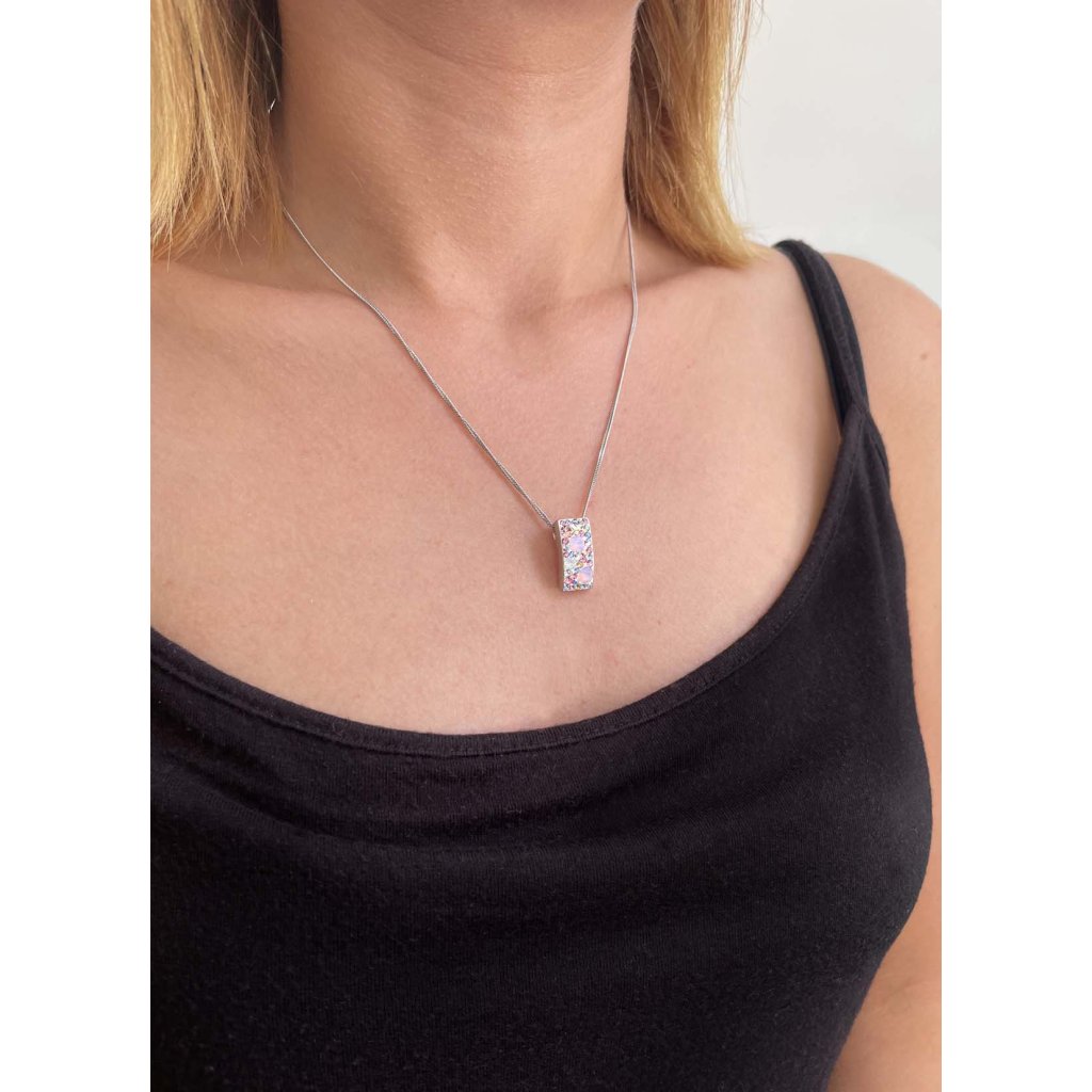 Obdĺžnikový prívesok je zdobený kryštálom Swarovski v ružovej farbe, ktorého pravosť si môžete overiť v certifikáte pravosti , ktorý vám k šperku pribalíme.