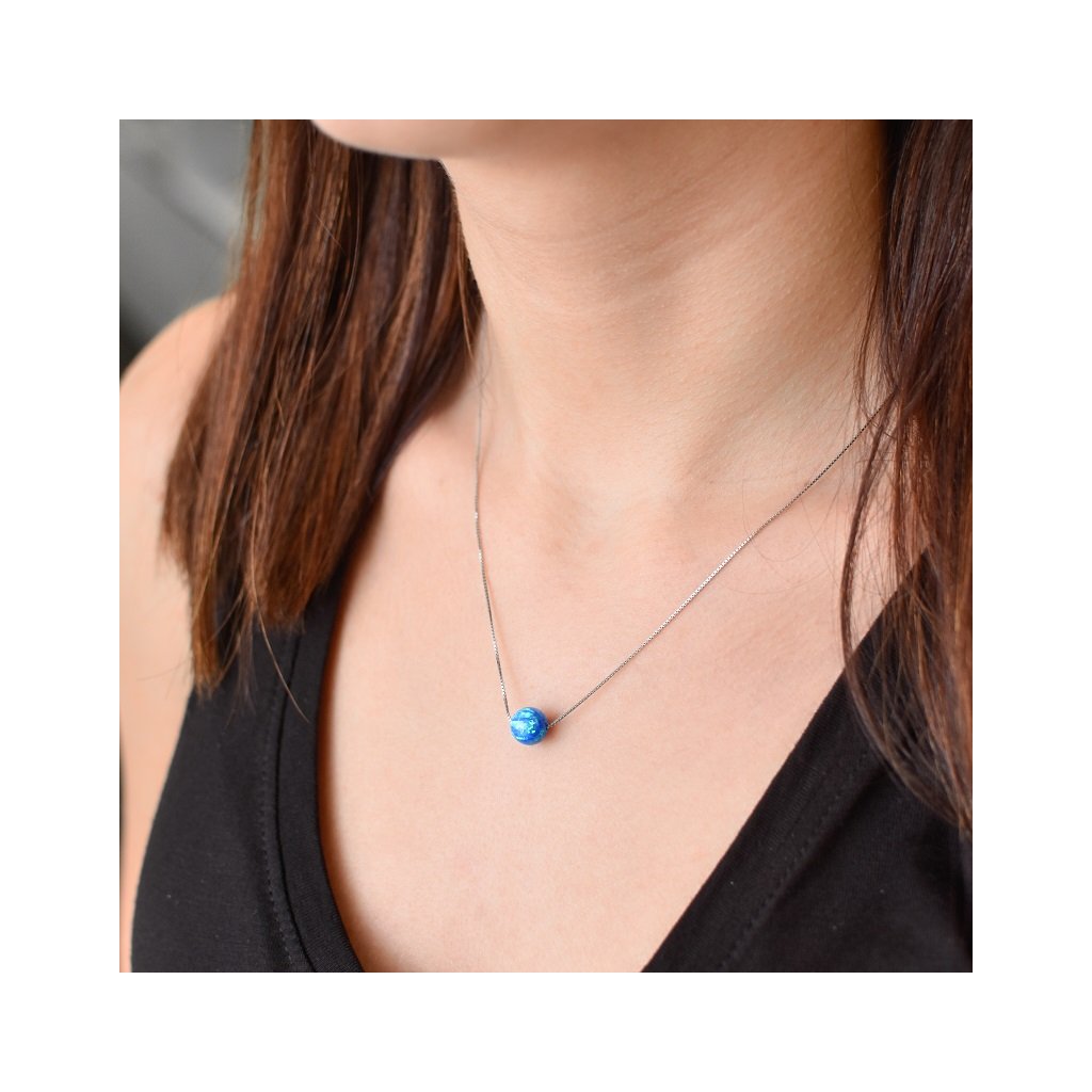 Planétka obiehajúca po obežnej dráhe - tak vyzerá okrúhly opál navlečený na striebornej retiazke.Retiazka 12044.3 je vyrobená zo striebra o rýdzosti 925/1000 vrátane povrchovej úpravy ródiom. Ródium ochráni šperk proti sčerneniu, zožltnutiu i poškriabaniu. Na retiazke je zavesený prívesok v tvare gule vyrobený zo syntetického opálu modrej farby. Náhrdelník neobsahuje nikel, a tak ho bez obáv z nepríjemnej reakcie môžu nosiť aj alergici.