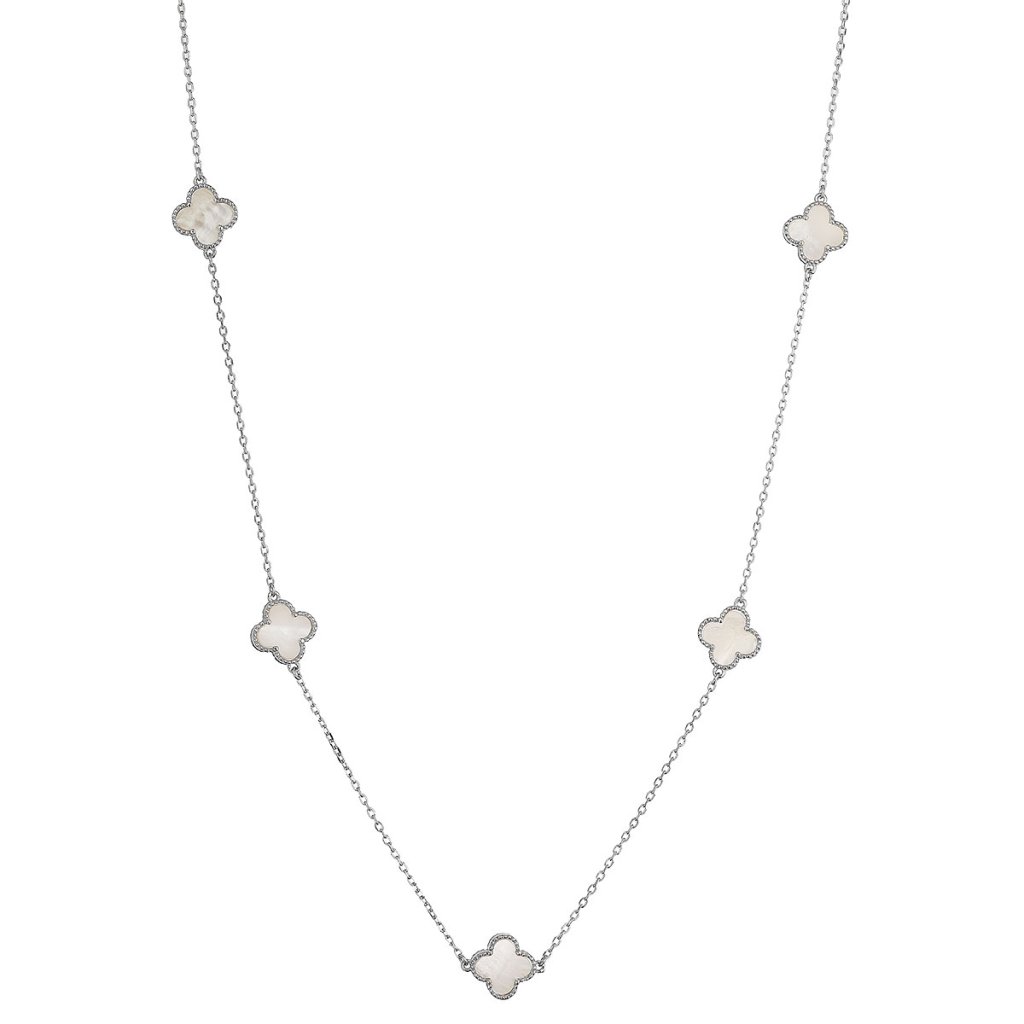 Jemný strieborný náhrdelník s pôvabnými štvorlístkami je symbolom šťastia a nadčasovej elegancie. Každý štvorlístok je vyplnený bielou perleťou, ktorá nádherne odráža svetlo a dodáva šperku kúzelný lesk.