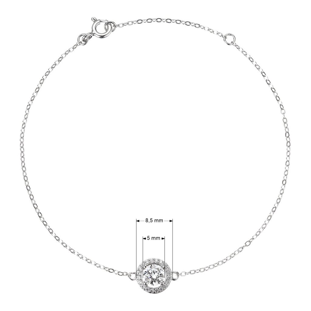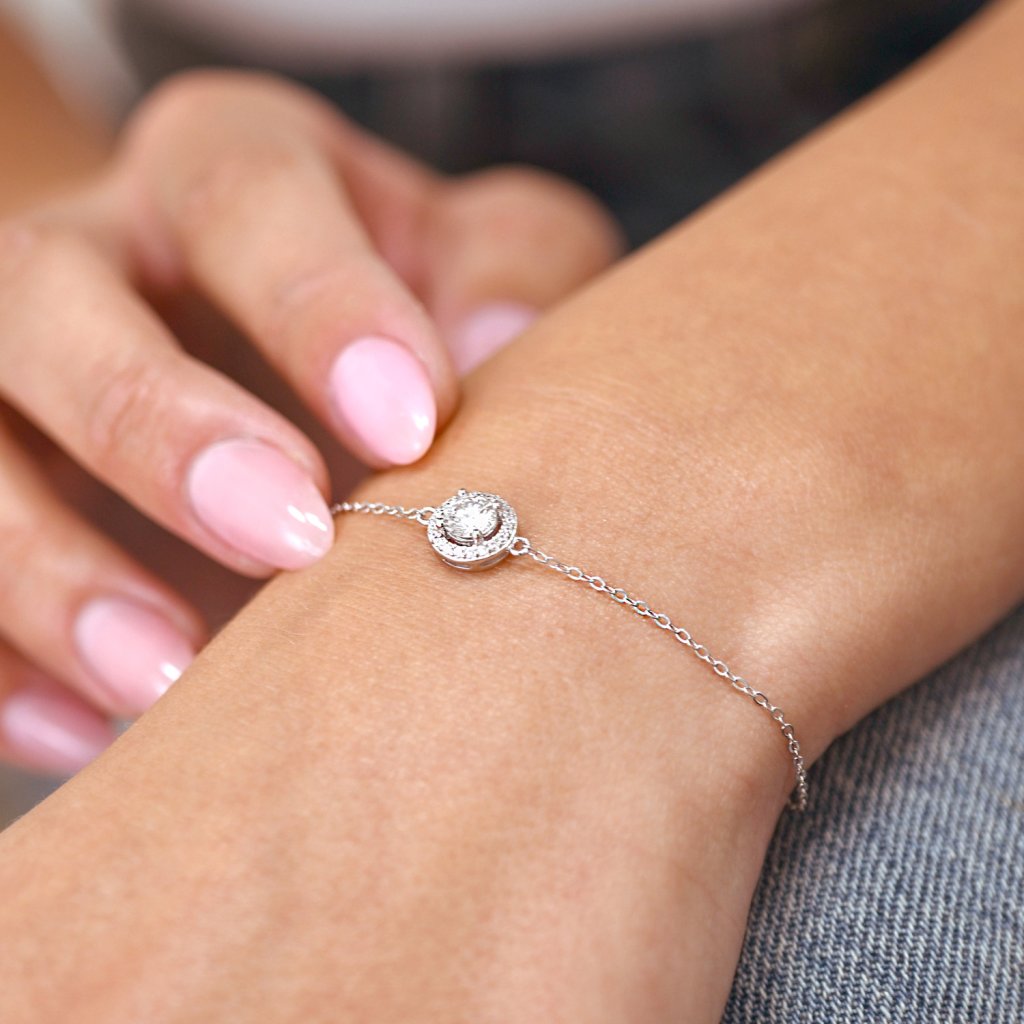Elegantný strieborný náramok zdobený veľkým okrúhlym moissanitom , obklopený drobnejšími kamienkami, vytvára nádhernú hru svetiel a lesku. Náramok je vyrobený zo striebra rýdzosti 925/1000. Vrstva z bieleho 18 kt. zlata zaisťuje luxusný lesk šperku a jeho dlhotrvajúcu odolnosť. Nastaviteľná dĺžka náramku a pohodlné zapínanie na karabínku z neho robí dokonalý doplnok pre každú príležitosť.