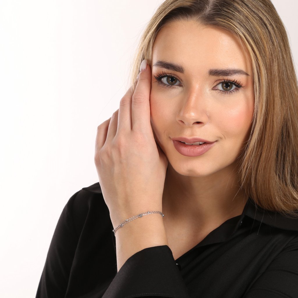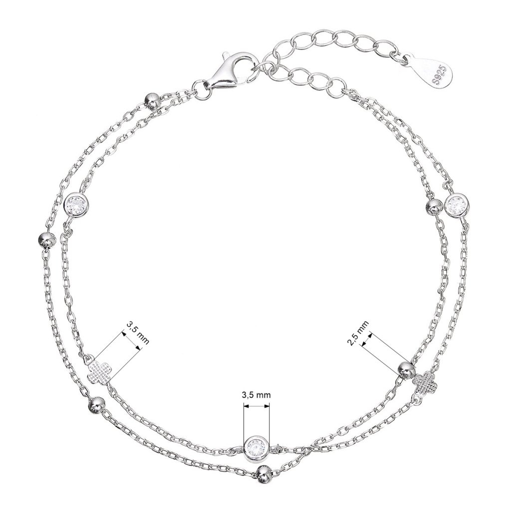 Očarujúce strieborný náramok, ktorý zaujme svojou ľahkosťou a hravými detailmi. Dvojitá retiazka je zdobená drobnými lesklými guličkami, trblietavými štvorlístkami a jemne zasadenými zirkónmi, ktoré dodávajú šperku iskrivý efekt. Vďaka predlžovacej retiazke si ľahko nastavíte ideálnu dĺžku. Skvelá voľba na každodenné nosenie aj špeciálne príležitosti.