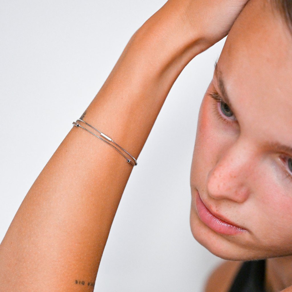 Jemný, dvojitý náramok, ktorý sa dá obliecť každé ráno, hodí sa ku všetkému a je moderný. Náramok je vyrobený z dvoch rovnakých retiazok spojených v jeden náramok. Retiazka je v tvare kociek a po jej obvode sú navyše lesklé obdĺžniky, ktoré upútajú pohľad.Strieborný náramok 63005 vyrábame zo striebra rýdzosti 925/1000 , ktorého povrch ošetrujeme ródiom . Rhodium šperk ochráni proti sčernaniu, zožltnutiu aj poškriabaniu. Keďže náramok neobsahuje žiadny prídavok niklu , môžu ho bez obáv nosiť aj alergici.