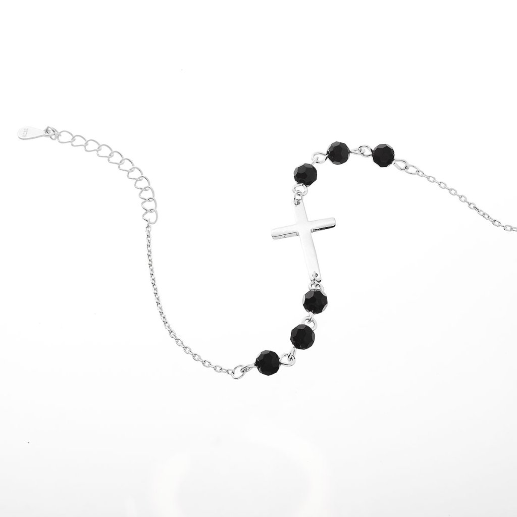 Elegancia, ktorá vám padne ako uliata! Tento pôvabný náramok kombinuje ligot strieborného krížika s tajomným leskom čiernych korálikov. Každý detail je starostlivo spracovaný z kvalitného striebra rýdzosti 925/1000 a vďaka ochrannej vrstve ródia si náramok zachová svoj dokonalý vzhľad po dlhú dobu. Pretože náramok neobsahuje nikel, môžete si ho užívať aj keď máte citlivú pokožku.