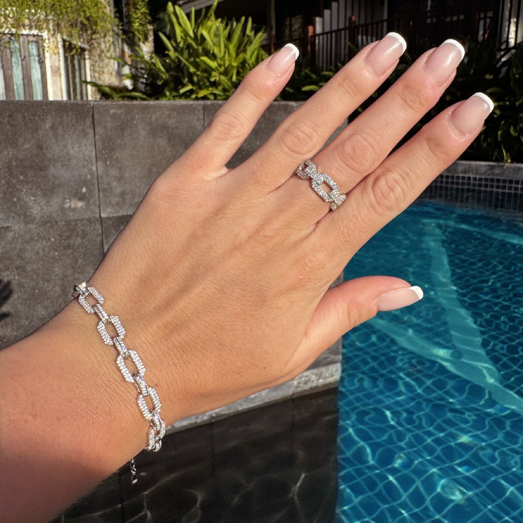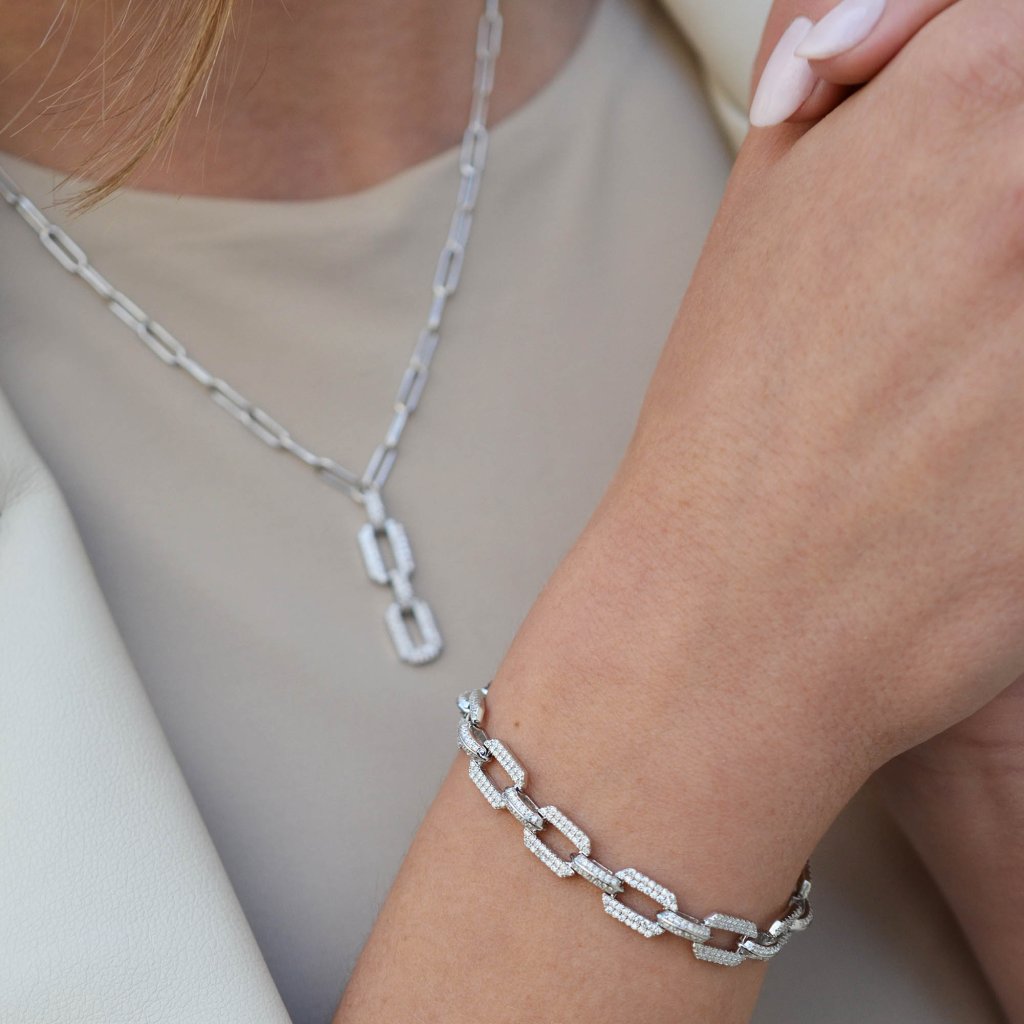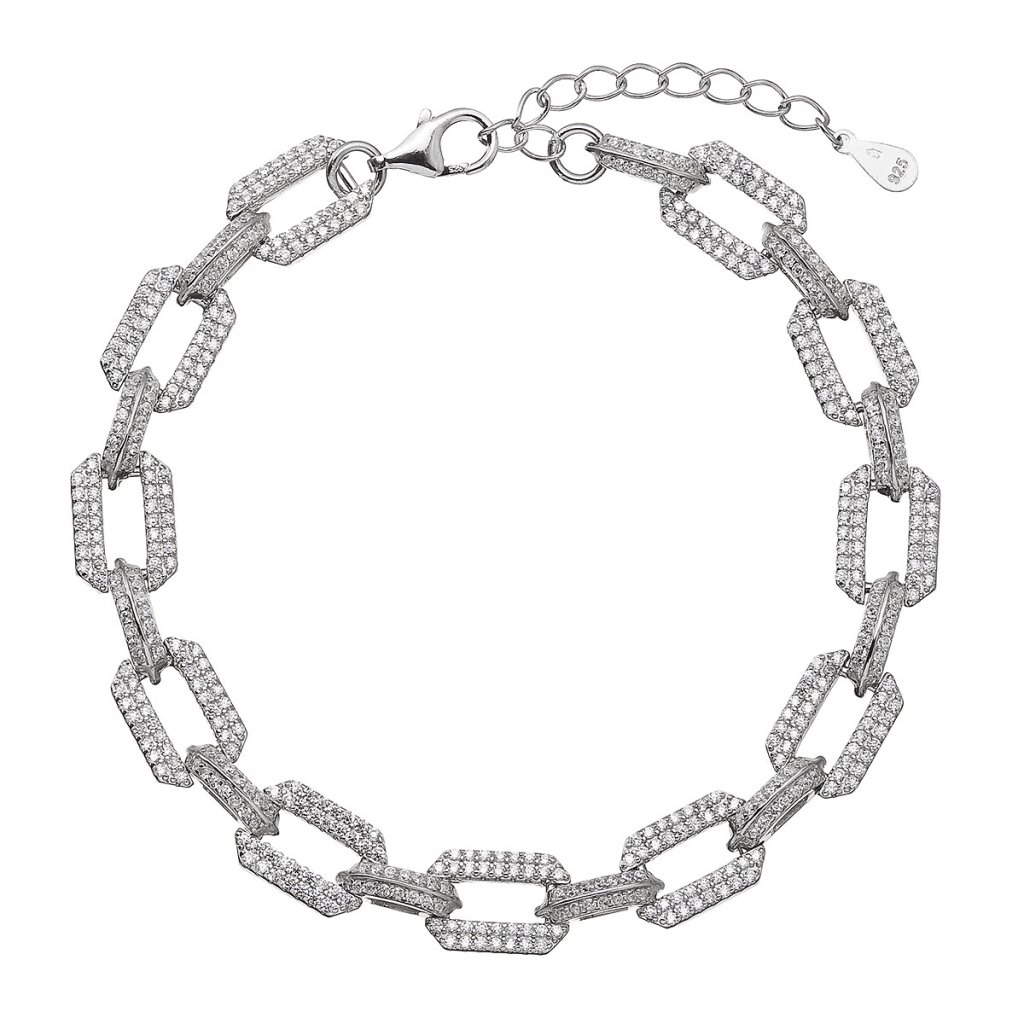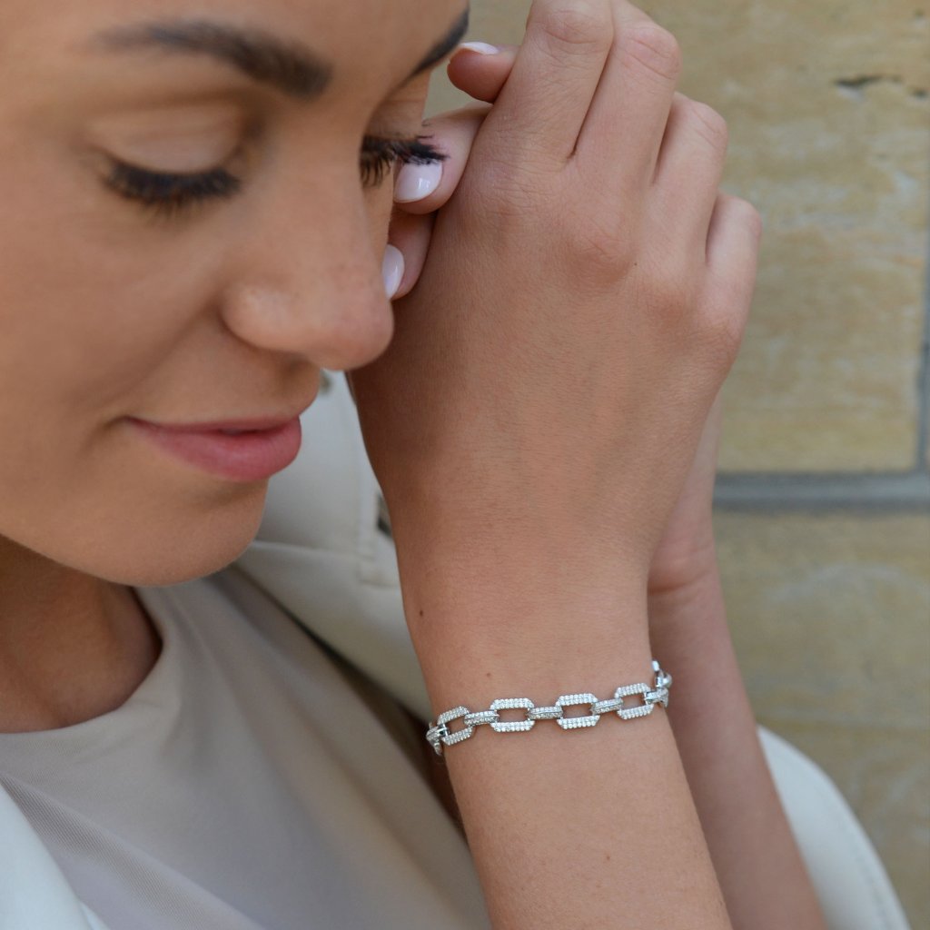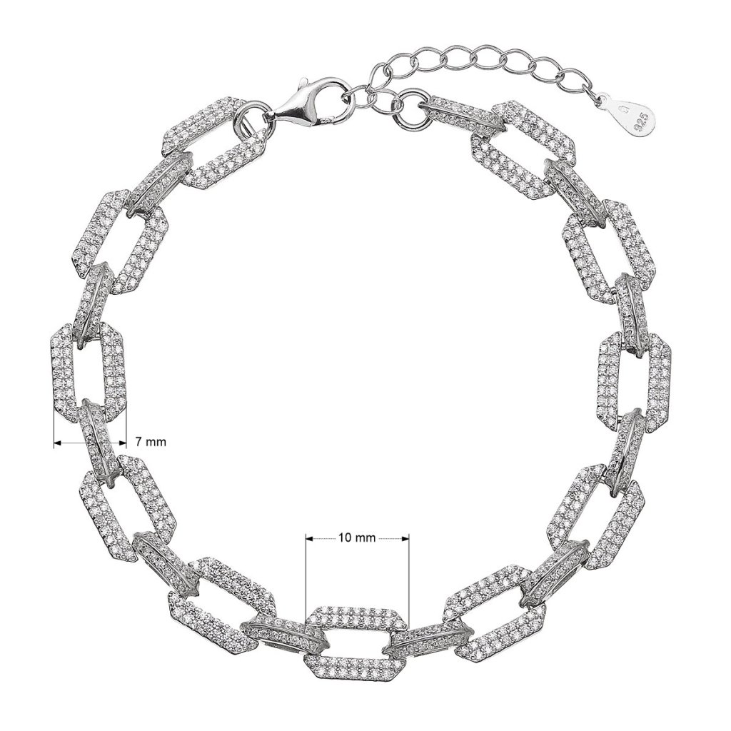 Náramok má dizajn reťaze s oválnymi očkami, každé inak orientované a je celý vysadený trblietavými zirkónmi vo farbe crystal. Tento detail dodáva šperku luxusný a nadčasový vzhľad. Náramok je dostupný v dĺžke 17 cm s predĺžením 3 cm a je vyrobený z hypoalergénneho materiálu bez obsahu niklu.