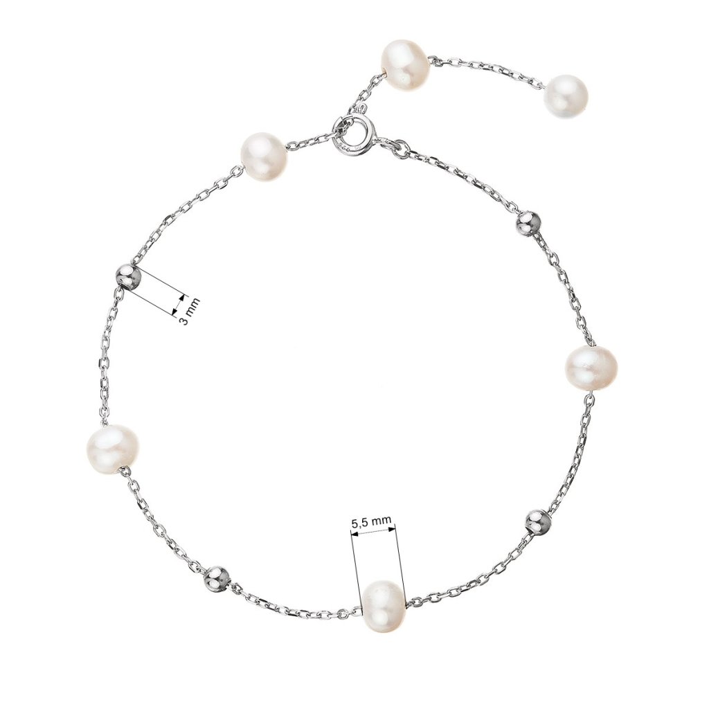 Veľmi obľúbená retiazka s pravými perlami pre každú príležitosť.Náramok 23021.1 je vyrobený zo striebra rýdzosti 925/1000 , ktoré prešlo povrchovou úpravou ródiom. Ródium chráni šperk proti sčerneniu, zožltnutiu i poškriabaniu. Retiazka je po obvode striedavo ozdobená bielymi riečnymi perlami a malými striebornými guličkami. Perly sú oválneho tvaru s priemerom cca 5,5 mm a kvality AA . Keďže šperk neobsahuje žiadny prídavok niklu , môžu ho bez obáv nosiť aj alergici.