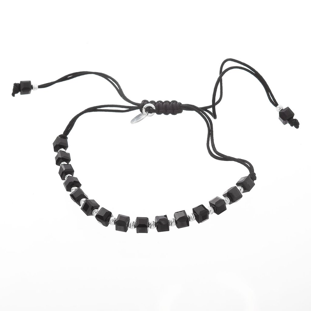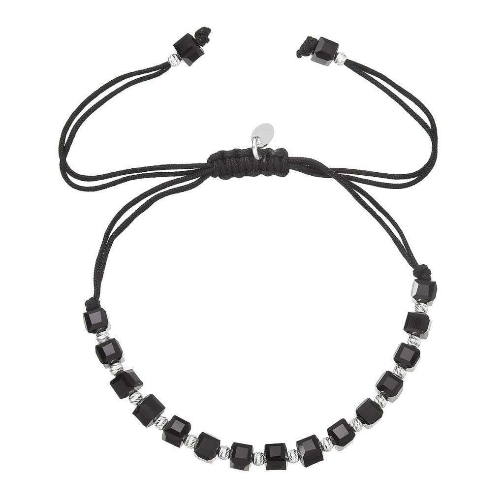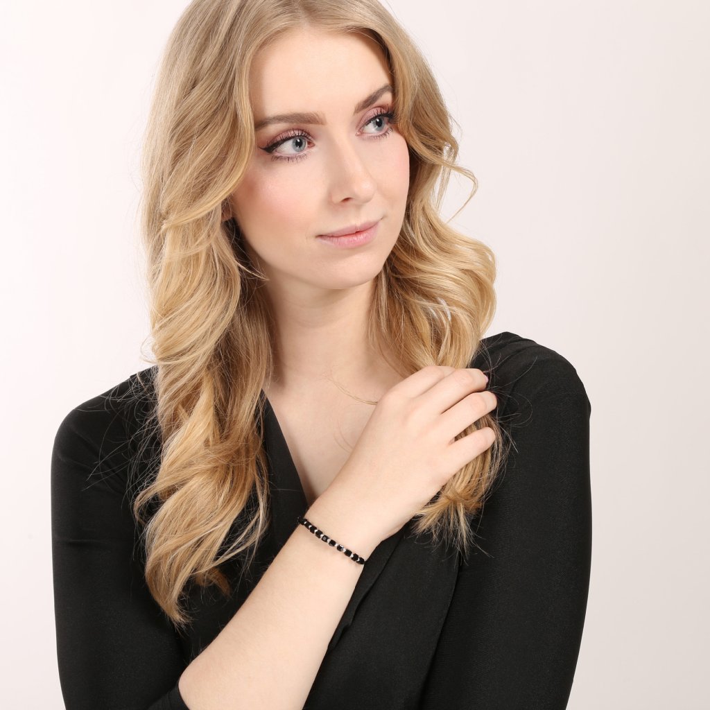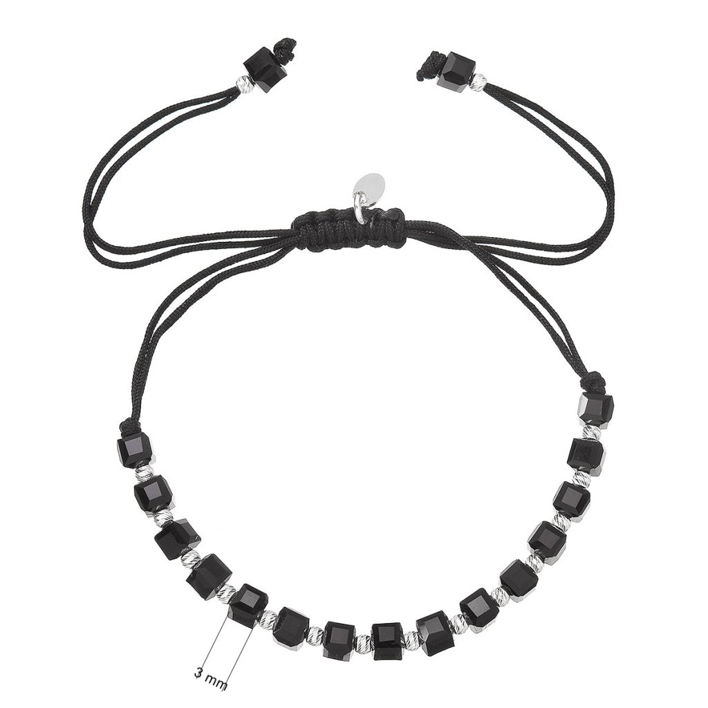 Tajomná elegancia v čiernostriebornom prevedení. Tento sofistikovaný korálkový náramok kombinuje trblietavé čierne fazetované korálky so striebornými prvkami, čím vytvára elegantný kontrast plný sofistikovanej krásy. Strieborné guličky medzi korálkami a pliešok s puncom dodávajú šperku moderný, čistý vzhľad. Vďaka praktickej textilnej šnúrke s nastaviteľnou dĺžkou 13-26 cm si môžete náramok prispôsobiť presne podľa svojich predstáv. Použité striebro rýdzosti 925/1000 s ochrannou vrstvou ródia zaisťuje dlhotrvajúcu krásu šperku bez sčernania či poškriabania. Náramok neobsahuje nikel, je teda vhodný aj na citlivú pokožku.