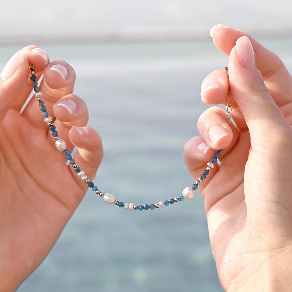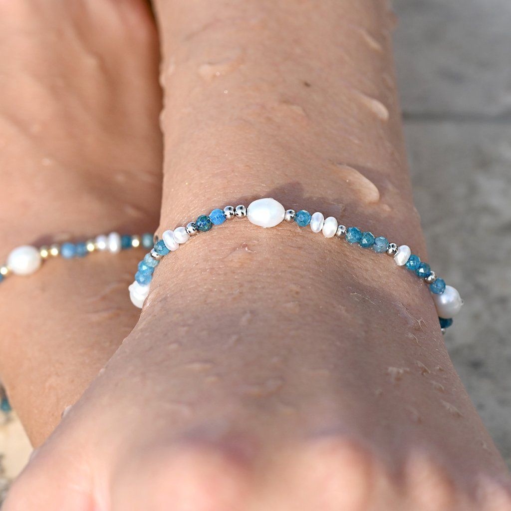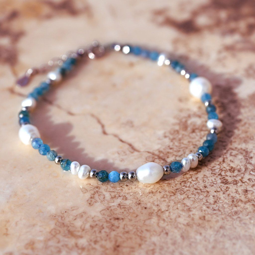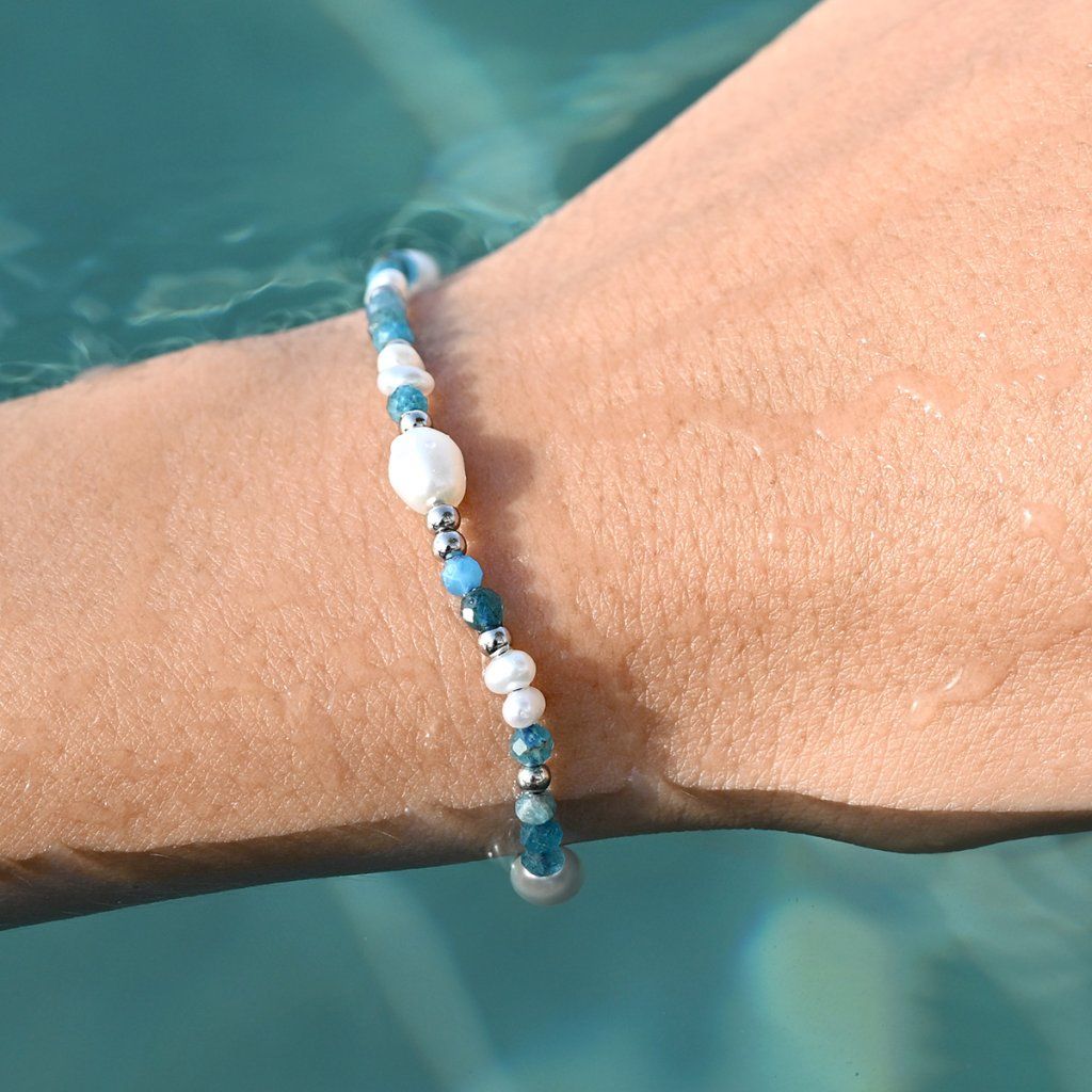 Tento jemný a elegantný náramok je tvorený kombináciou pravých riečnych perál rôznych tvarov a drobných korálikov apatitu v krásnej modrej farbe. Lesklé perly s prirodzeným perleťovým odleskom pôsobia luxusne, zatiaľ čo apatity dodávajú šperku sviežosť a ľahko morský nádych.