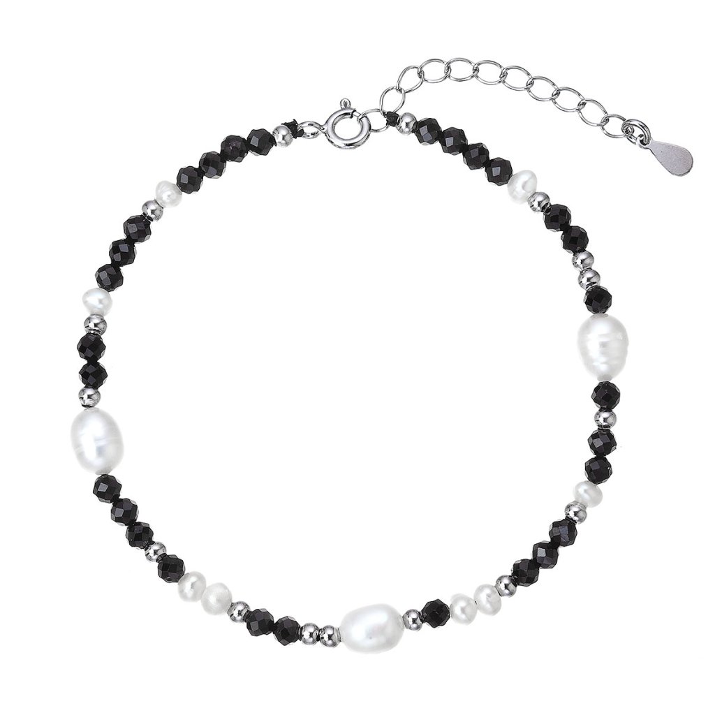 Tento elegantný náramok je tvorený kombináciou pravých čiernych spinelov a pravých bielych riečnych perál rôznych tvarov, ktoré dohromady vytvárajú harmonický a ženský celok. Drobné brúsené spinely sa krásne lesknú a dokonale ladia s prirodzeným perleťovým ligotom perál.