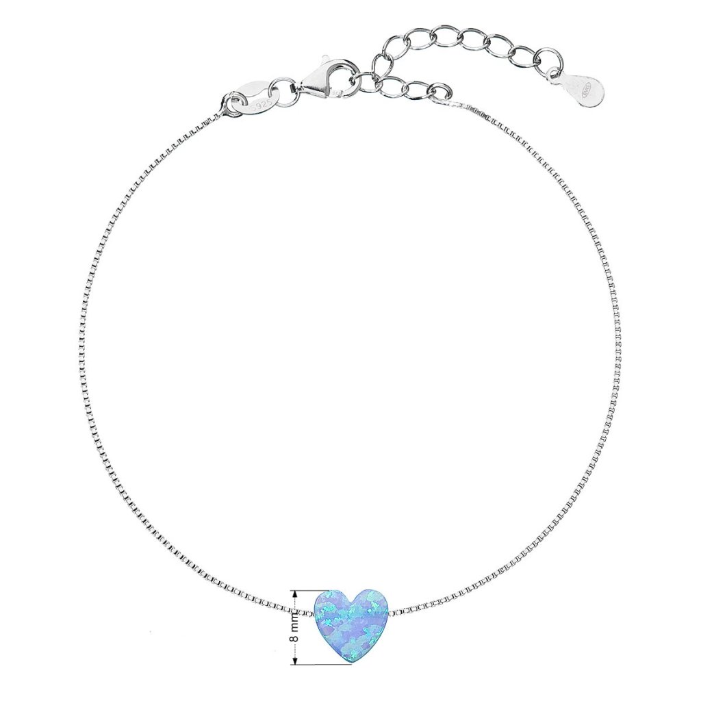 Jednoduchý náramok je vyrobený zo striebra o rýdzosti 925/1000 vrátane povrchovej úpravy ródiom. Ródium ochráni šperk proti sčerneniu, zožltnutiu i poškriabaniu. Retiazka náramku je prevlečená srdiečkom zo syntetického opálu svetlo modrej farby. Náramok neobsahuje nikel, a tak ho bez obáv z nepríjemnej reakcie môžu nosiť aj alergici.