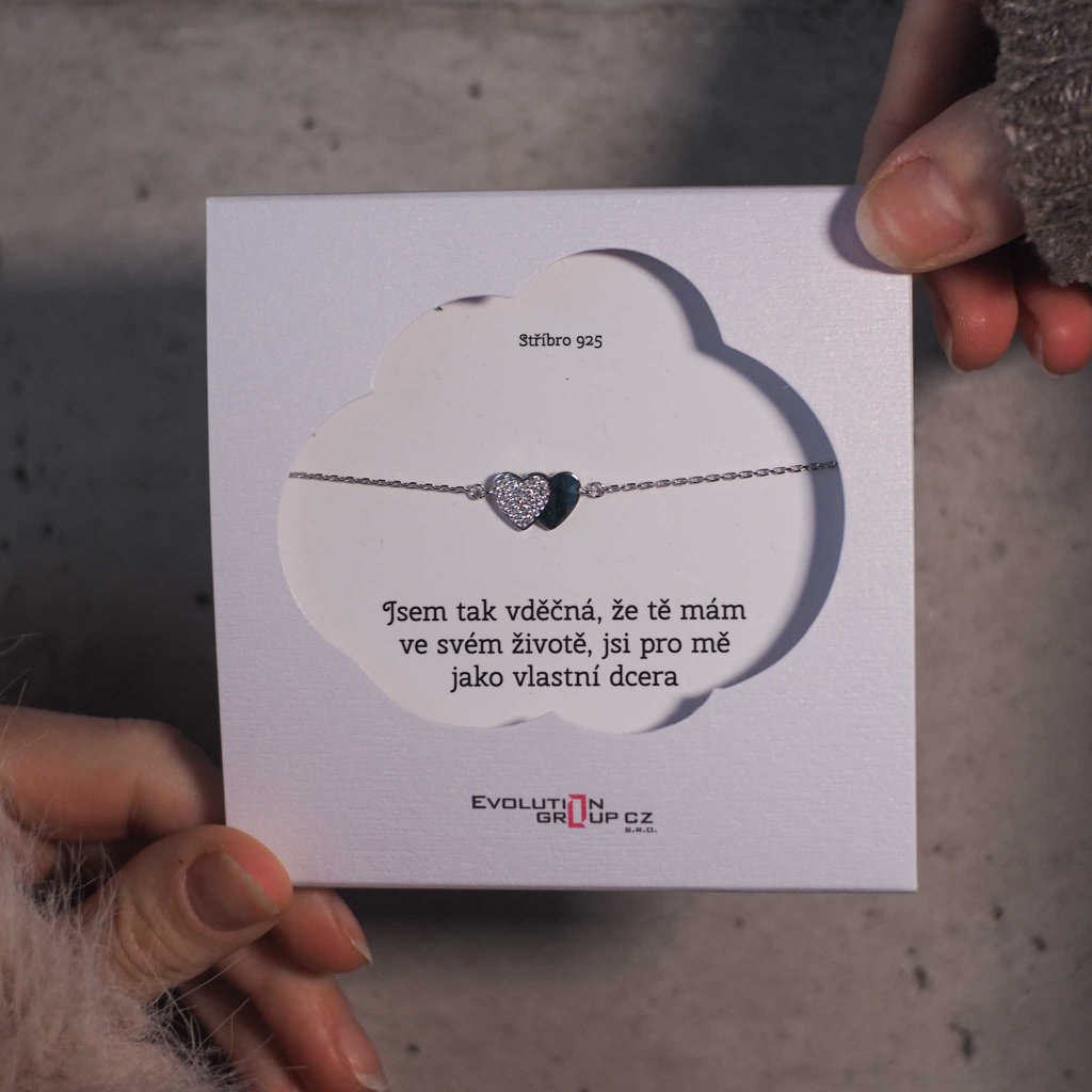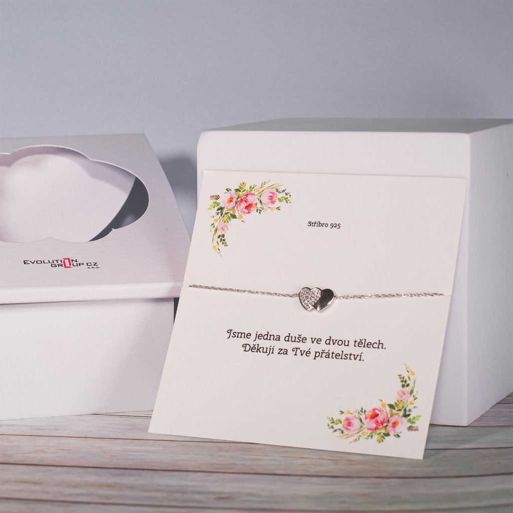 Náramok dve srdcia 13010.1 vyrábame zo striebra rýdzosti 925/1000, ktorého povrch ošetrujeme ródiom . Rhodium šperk ochráni proti sčernaniu, zožltnutiu aj poškriabaniu. Náramok zdobí jemná retiazka a dve prepojené srdcia, kde jedno je osadené bielymi zirkónmi.