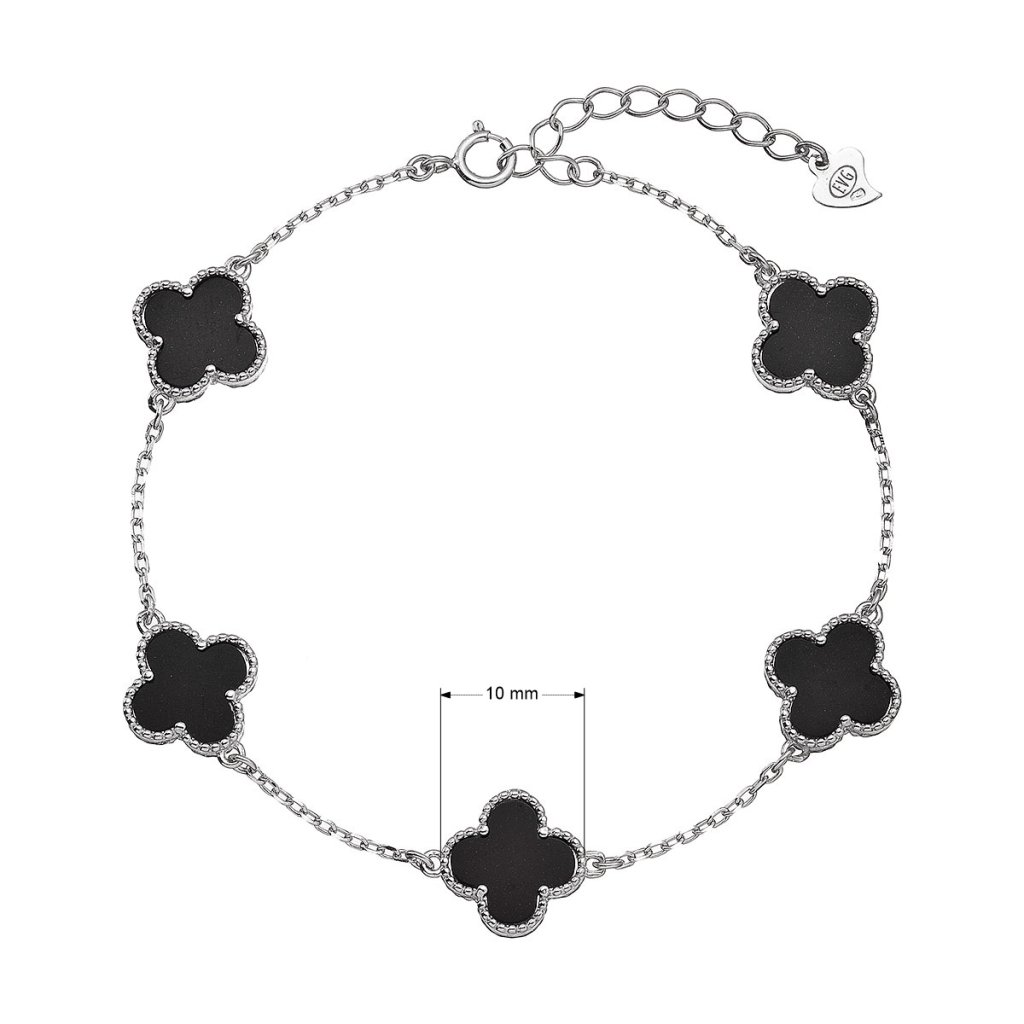 Jemný strieborný náramok s pôvabnými štvorlístkami je symbolom šťastia a nadčasovej elegancie. Každý štvorlístok je vyplnený čiernym pinolitom, ktorý dodáva šperku jedinečný a tajomný charakter.
