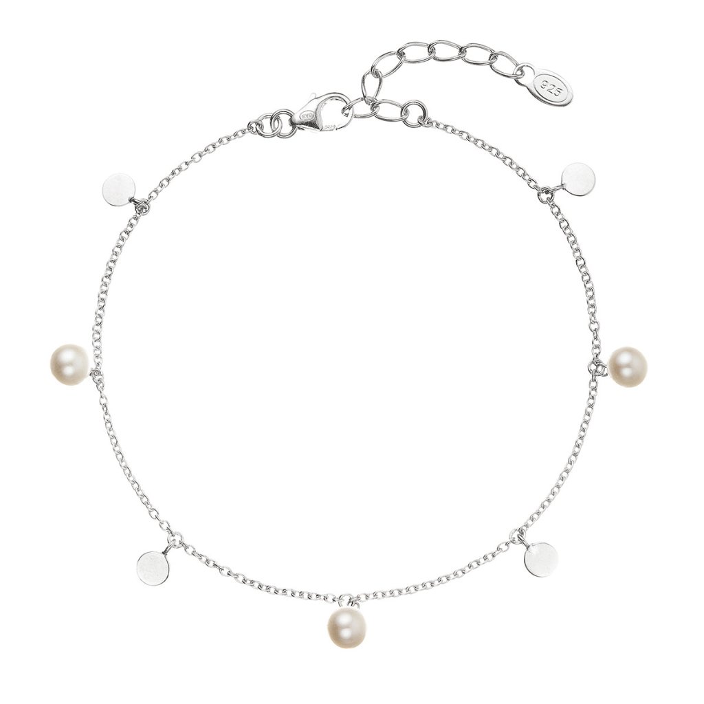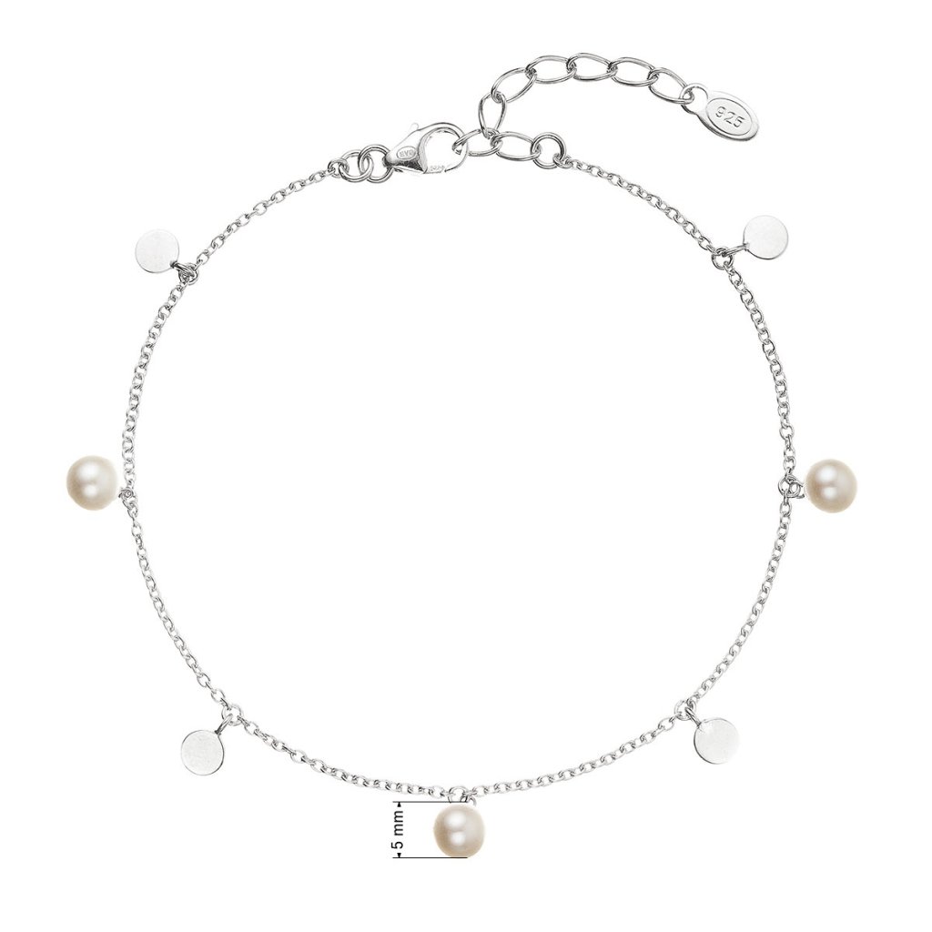 Veľmi nežne pôsobiaci jednoduchý náramok so žiarivými perlami a placičkami.Náramok je vyrobený zo striebra rýdzosti 925/1000, ktoré prešlo povrchovou úpravou ródiom. Ródium chráni šperk proti sčerneniu, zožltnutiu i poškriabaniu. Keďže šperk neobsahuje žiadny prídavok niklu , môžu ich bez obáv nosiť aj alergici.