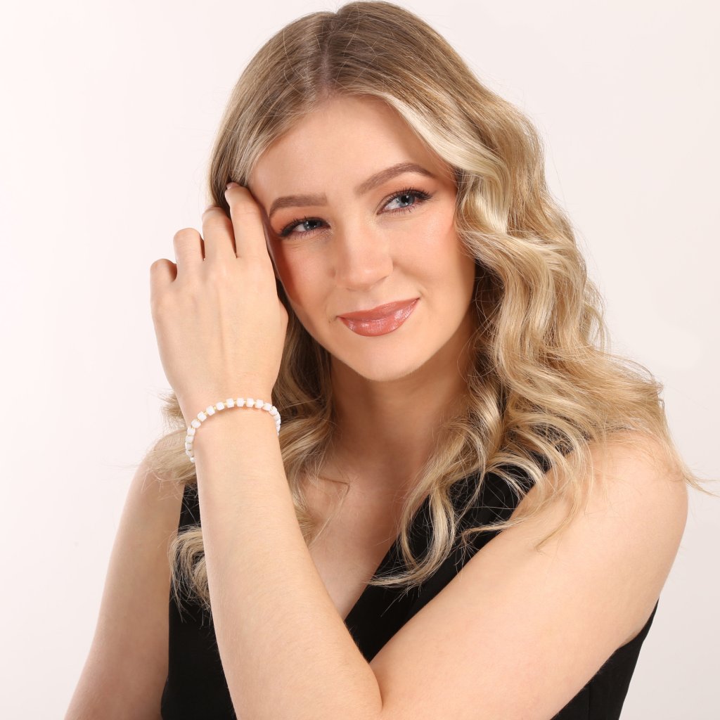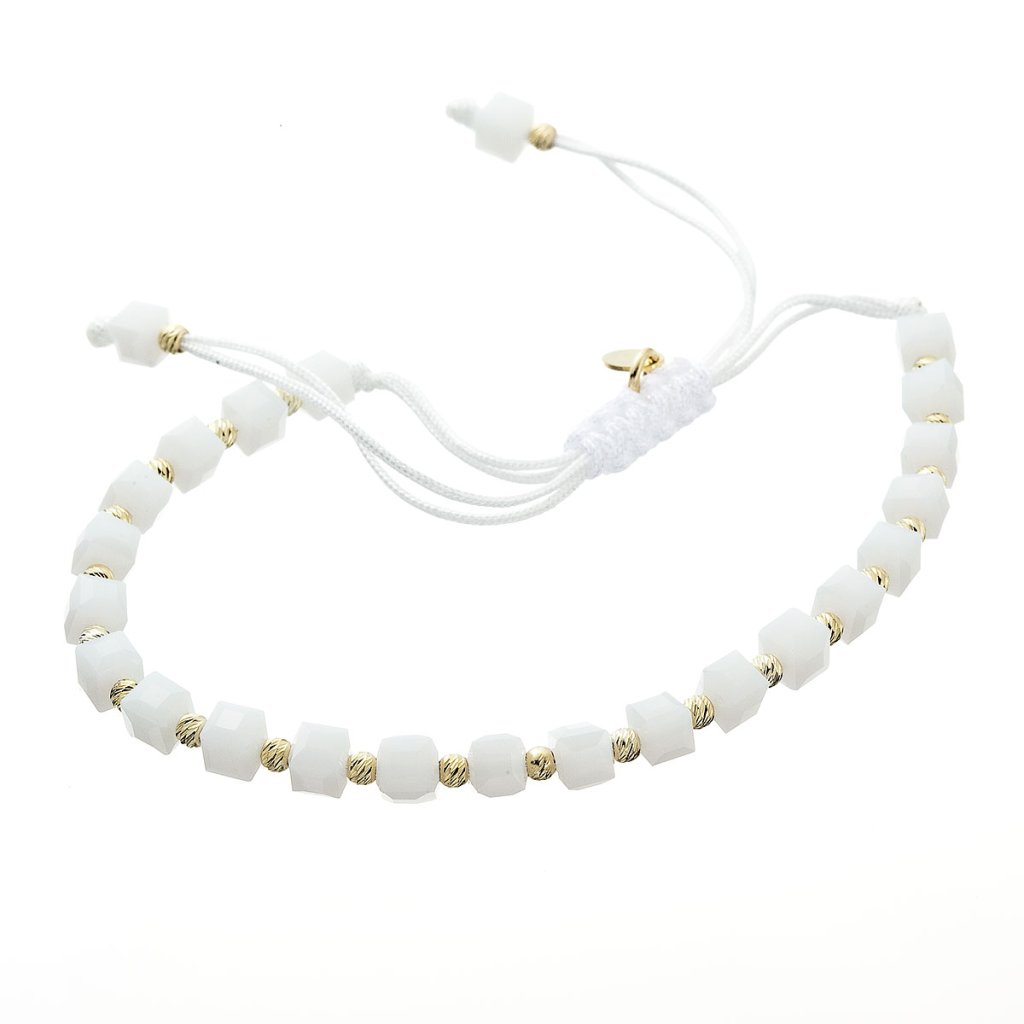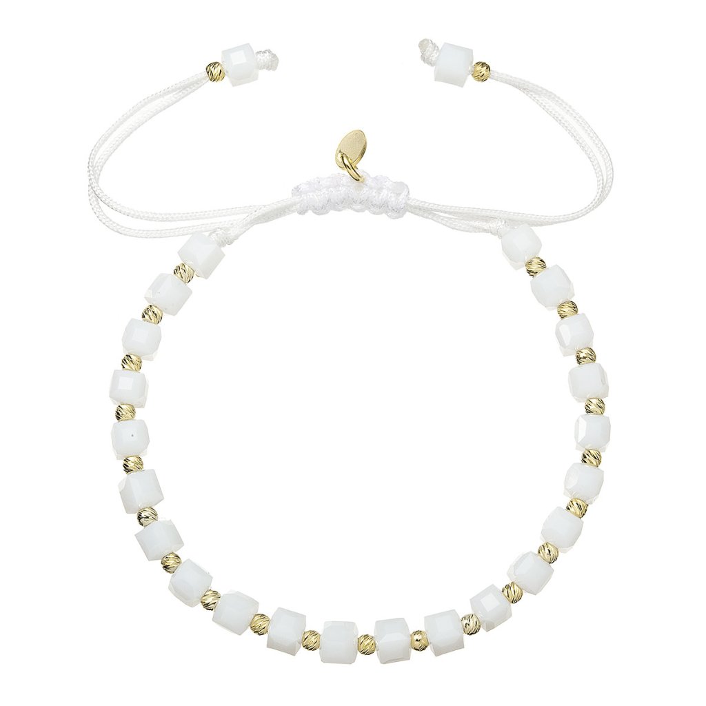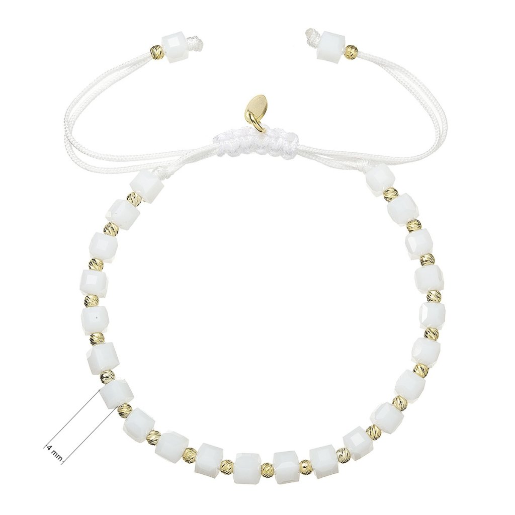 Čistá elegancia v každom detaile. Tento pôvabný korálkový náramok spája trblietavé biele fazetované korálky so zlatými prvkami pre nadčasovú kombináciu, ktorá rozžiari každý outfit. Pozlátené strieborné guličky medzi korálkami a pliešok s puncom dodávajú šperku nádych luxusu. Praktická textilná šnúrka s nastaviteľnou dĺžkou 13-26 cm umožňuje prispôsobiť náramok presne podľa vašich predstáv. Použité striebro rýdzosti 925/1000 s ochrannou vrstvou ródia zaisťuje dlhotrvajúcu krásu šperku bez sčernania či poškriabania. Náramok neobsahuje nikel, je teda vhodný aj na citlivú pokožku.
