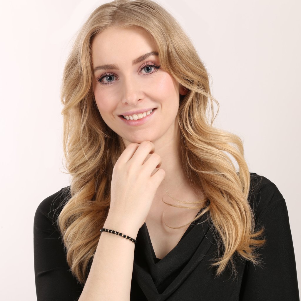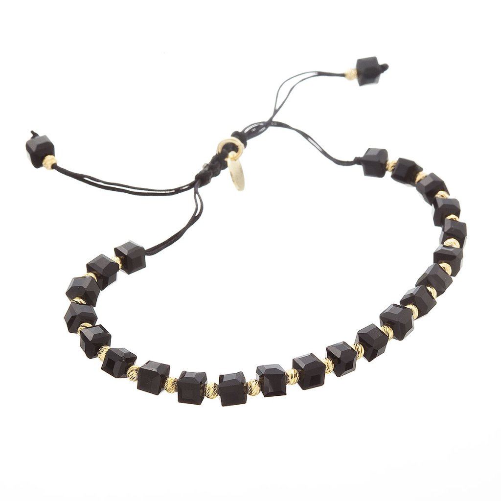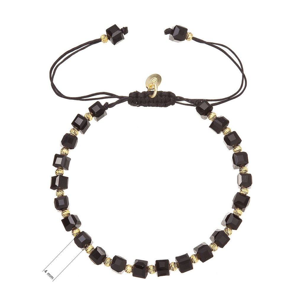 Tajomná elegancia v čiernom prevedení . Tento podmanivý korálkový náramok v sebe snúbi trblietavé čierne fazetované korálky so zlatými prvkami, čím vytvára dramatický kontrast plný mystického kúzla. Pozlátené strieborné guličky medzi korálkami a pliešok s puncom dodávajú šperku sofistikovaný nádych luxusu. Vďaka praktickej textilnej šnúrke s nastaviteľnou dĺžkou 13-26 cm si môžete náramok prispôsobiť presne podľa svojich predstáv. Použité striebro rýdzosti 925/1000 s ochrannou vrstvou ródia zaisťuje dlhotrvajúcu krásu šperku bez sčernania či poškriabania. Náramok neobsahuje nikel, je teda vhodný aj na citlivú pokožku.