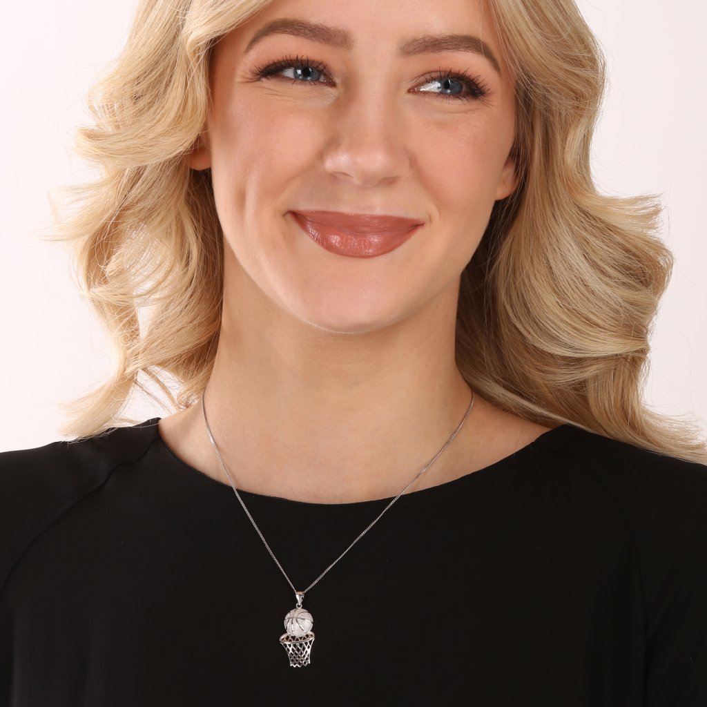 Strieborný prívesok v tvare basketbalovej lopty a košíka je jedinečným a štýlovým šperkom, ktorý osloví každého milovníka tohto dynamického športu .
