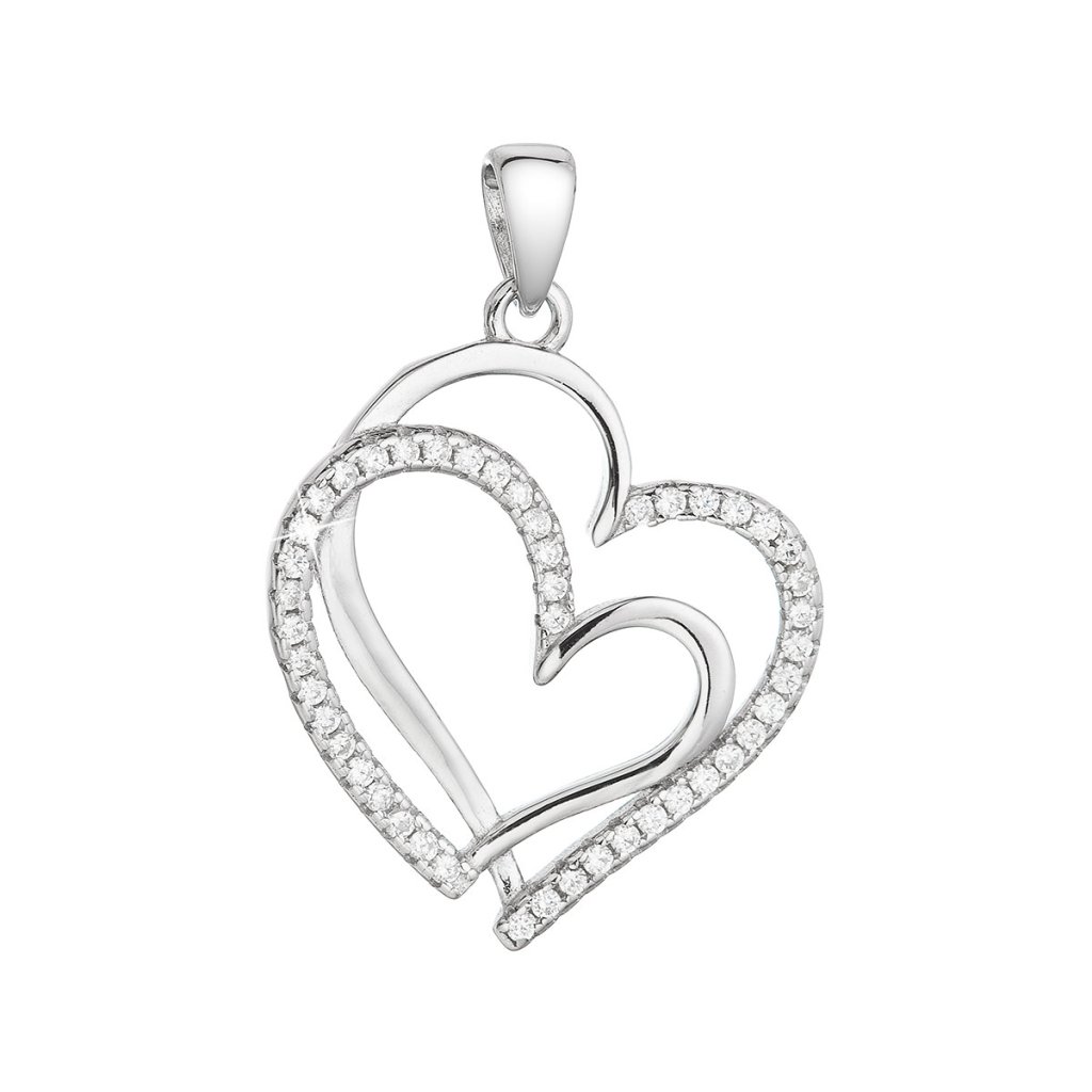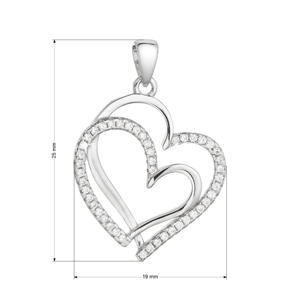 Strieborný prívesok v tvare 2 sŕdc je zdobený zirkónmi bielej farby.