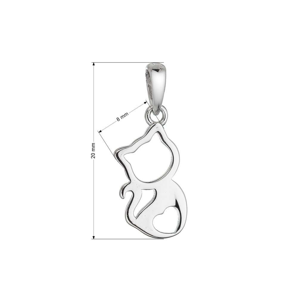 Prívesok 64039 je vyrobený zo striebra rýdzosti 925/1000, ktorého povrch je upravený ródiom. Rhodiová úprava chráni šperk pred sčernením a zaisťuje jeho dlhodobý lesk. Dizajn prívesku je ladne minimalistický – mačička má elegantne prehnutý chvostík, zaoblené tvary a decentný výrez v tvare srdiečka dodáva celku osobný rozmer.