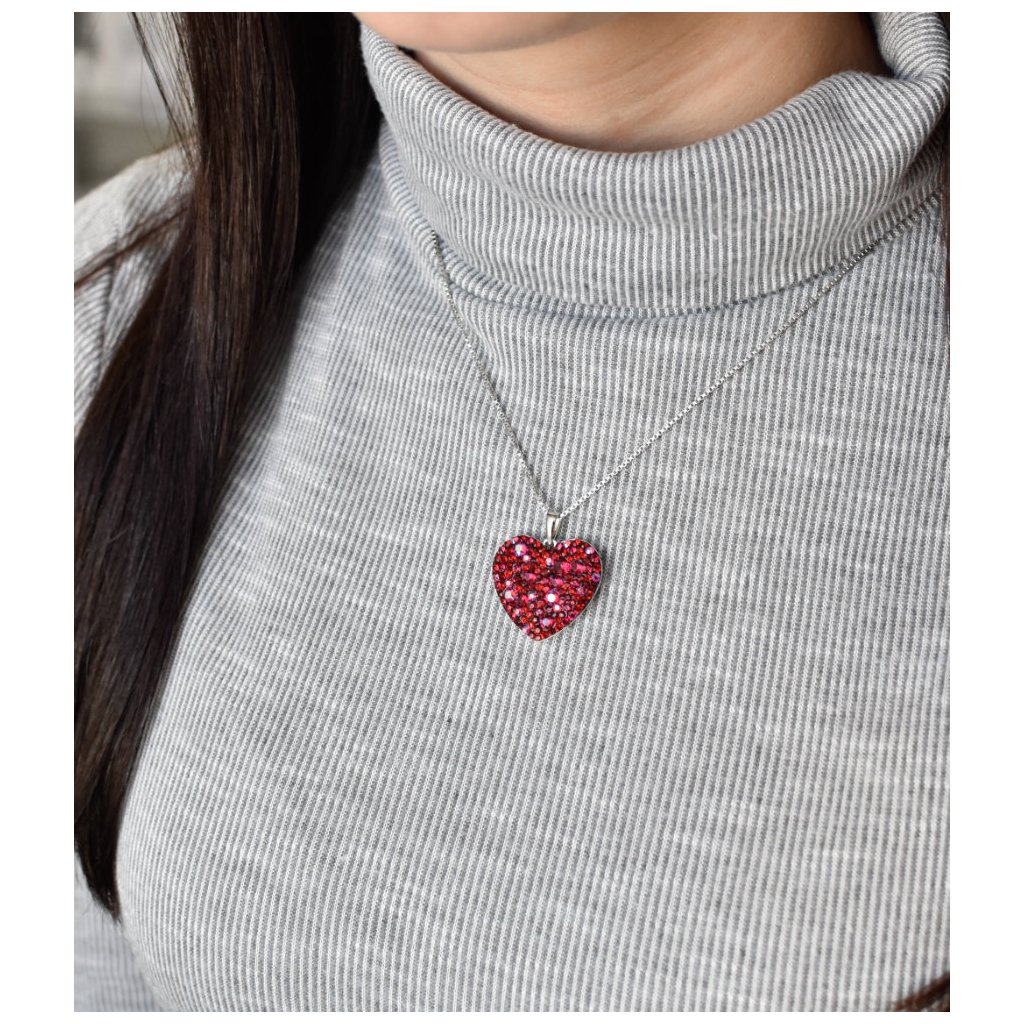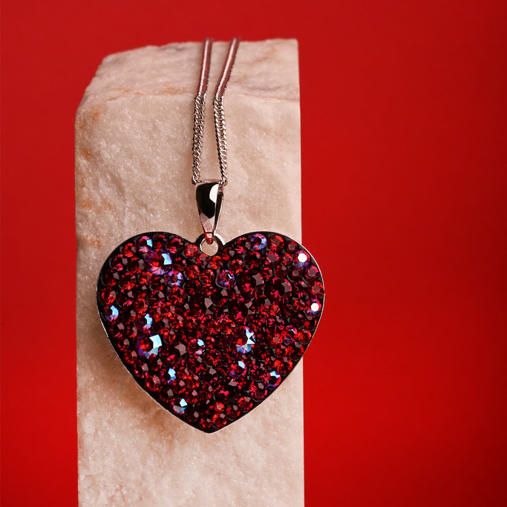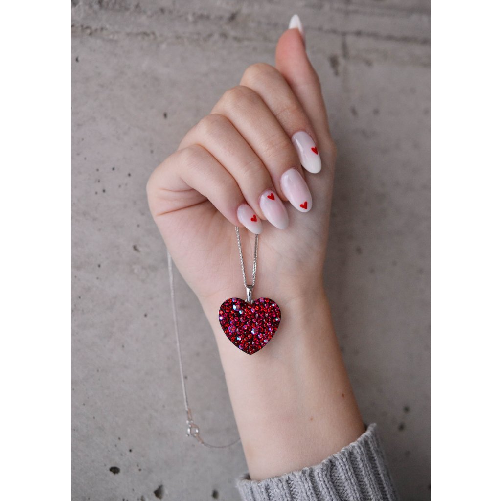 Srdiečko je vysadené Swarovski kryštálmi v červenej farbe.