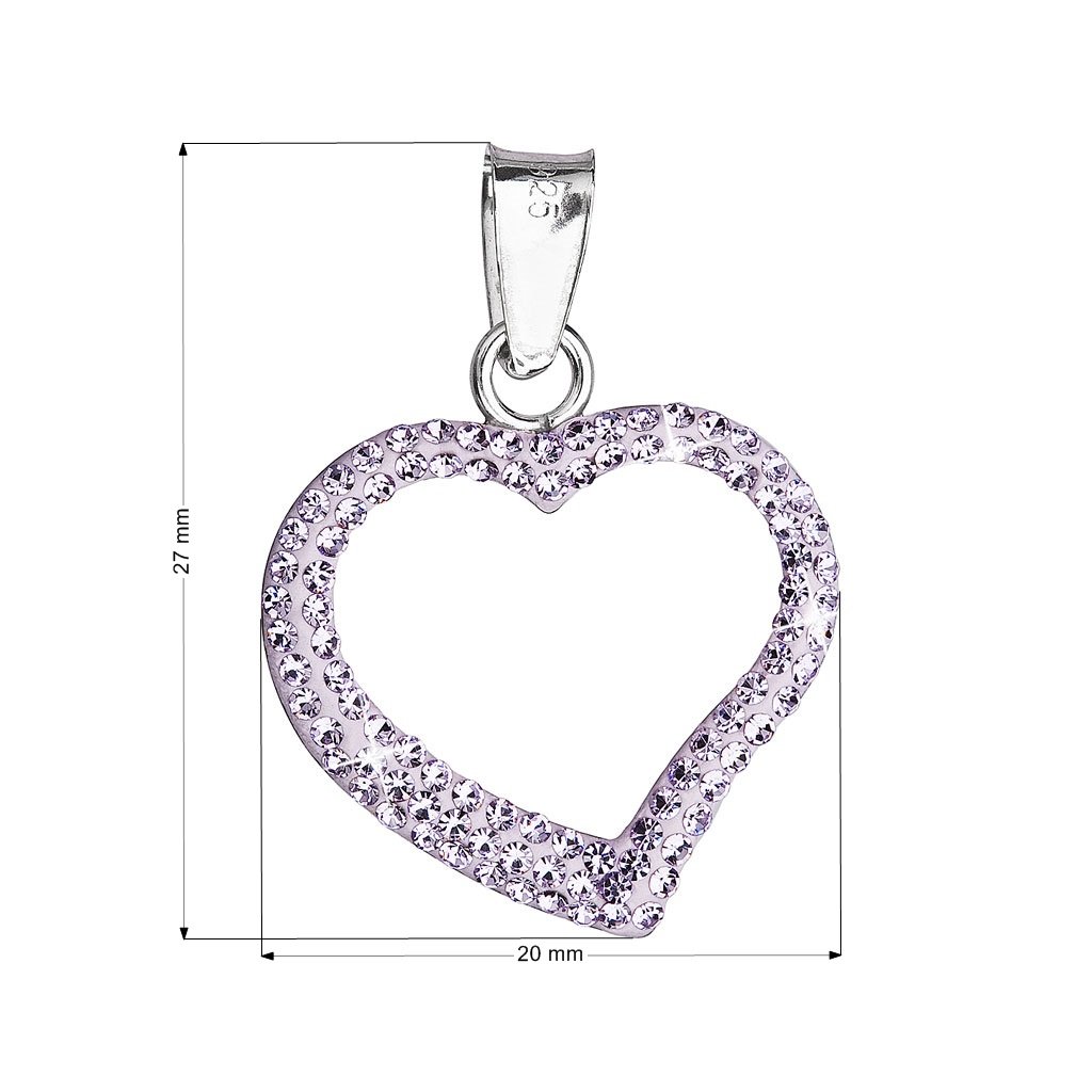Strieborný prívesok 34093.3 s dĺžkou 27 mm v tvare srdca je vysadený mnohými trblietavými Swarovski kryštálmi vo fialovej farbe. Na prívesok bolo použité striebro rýdzosti 925/1000 , ktorého povrch prešiel úpravou ródiom. Rhodium šperk ochráni proti sčernaniu, zožltnutiu alebo poškriabaniu. Keďže šperk neobsahuje žiadny prídavok niklu, je vhodný aj pre alergikov.