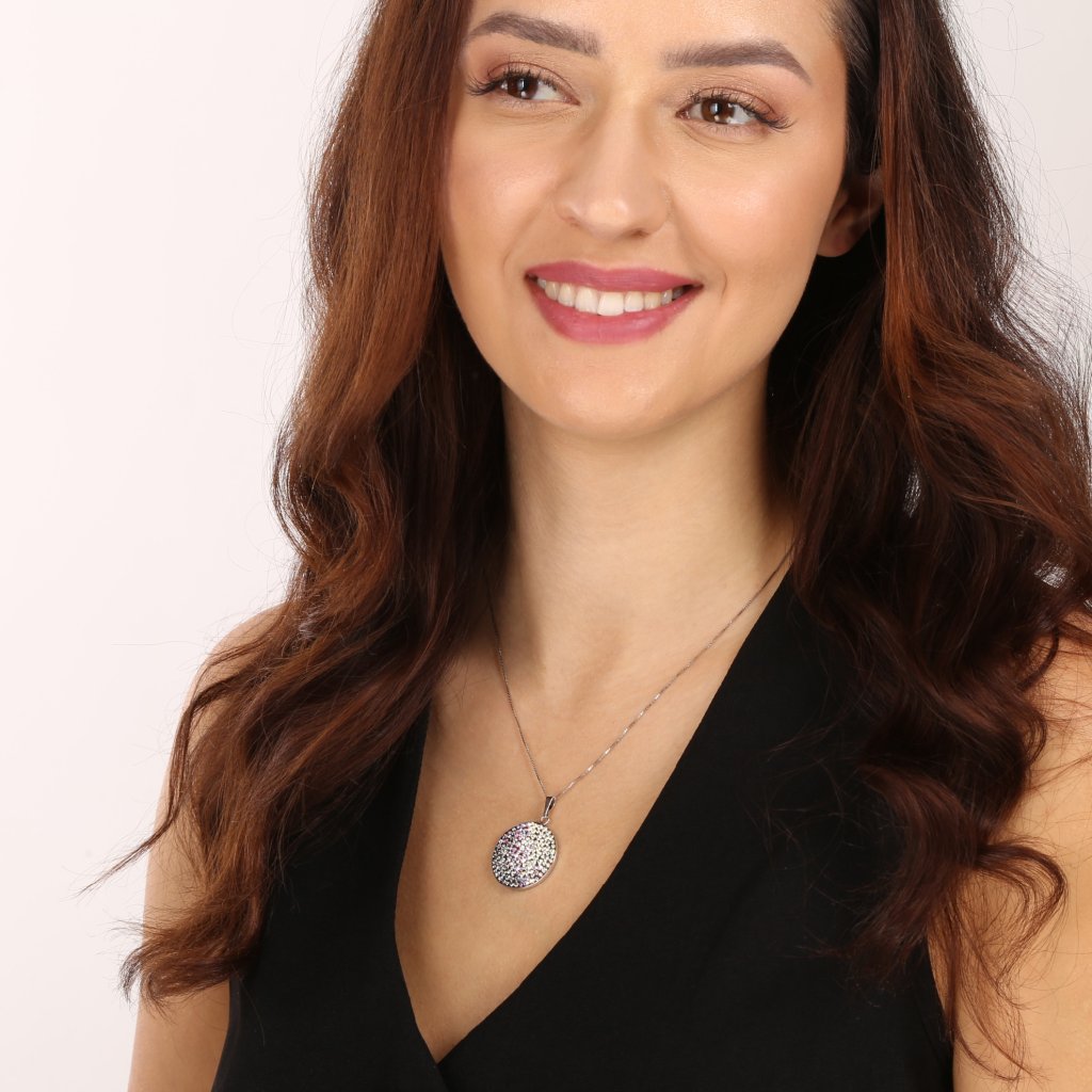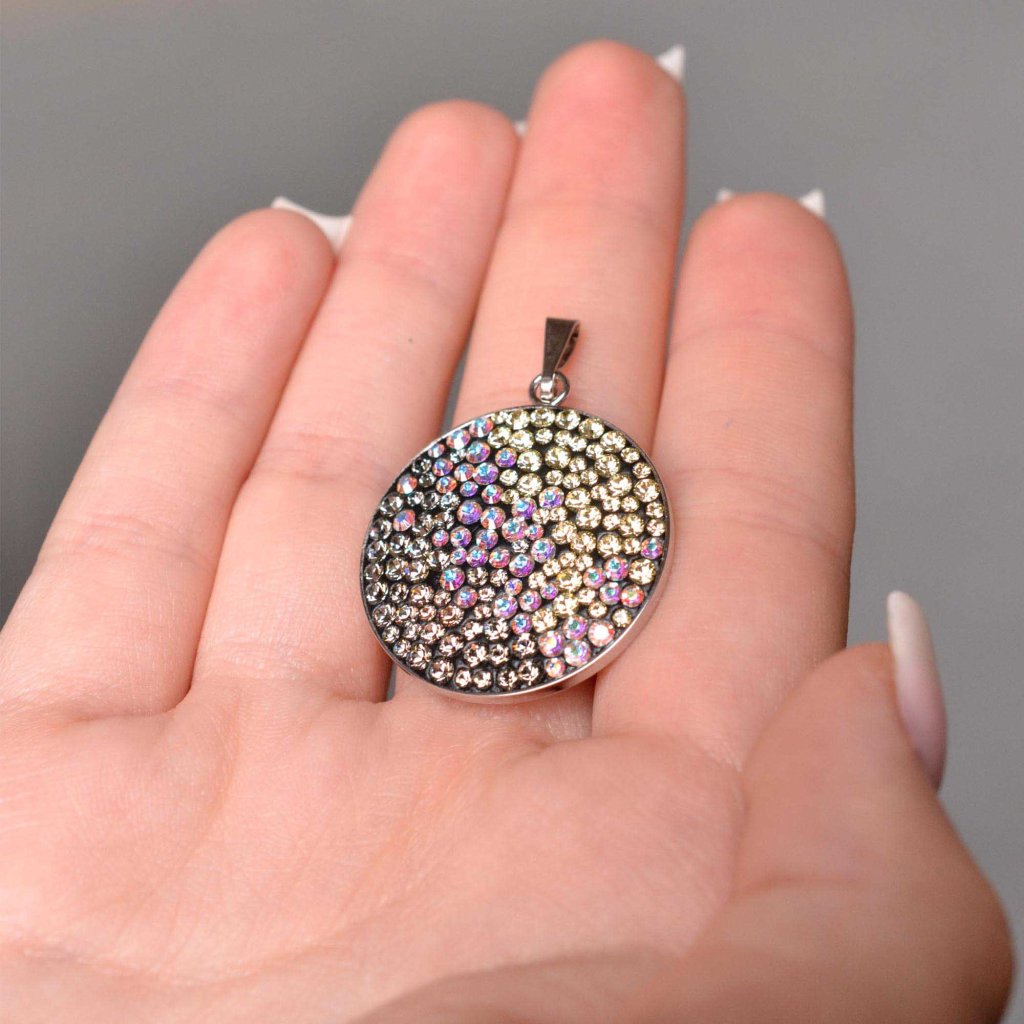 Obzeráte sa po výraznom, luxusne zdobenom prívesku, ktorým by ste mohli doplniť svoj outfit? Odporúčame okrúhly strieborný prívesok bohato vysadený Swarovski kryštálmi !Strieborný okrúhly prívesok 34131.3 má priemer 25 mm a je zdobený mnohými malými okrúhlymi Swarovski kryštálmi v rôznych farbách. Na prívesok bolo použité striebro rýdzosti 925/1000, ktorého povrch prešiel úpravou ródiom. Rhodium šperk ochráni proti sčernaniu, zožltnutiu alebo poškriabaniu. Prívesok neobsahuje nikel , a tak ho môžu bez obáv nosiť aj alergici.