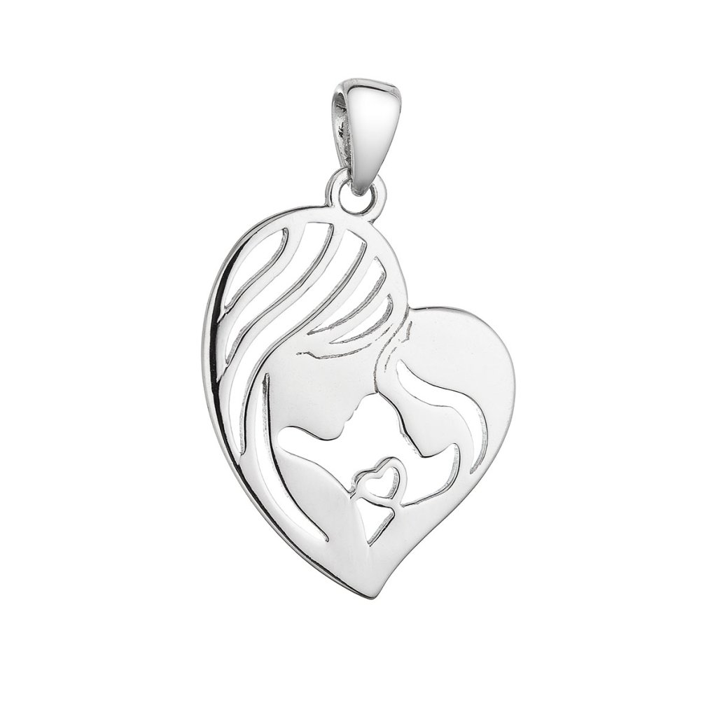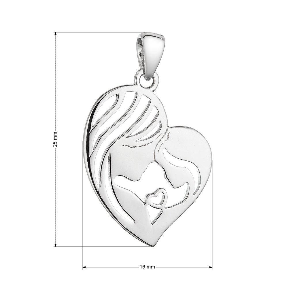 Strieborný prívesok v tvare srdca je zdobený zirkónom bielej farby a symbolizuje matku a dieťa.