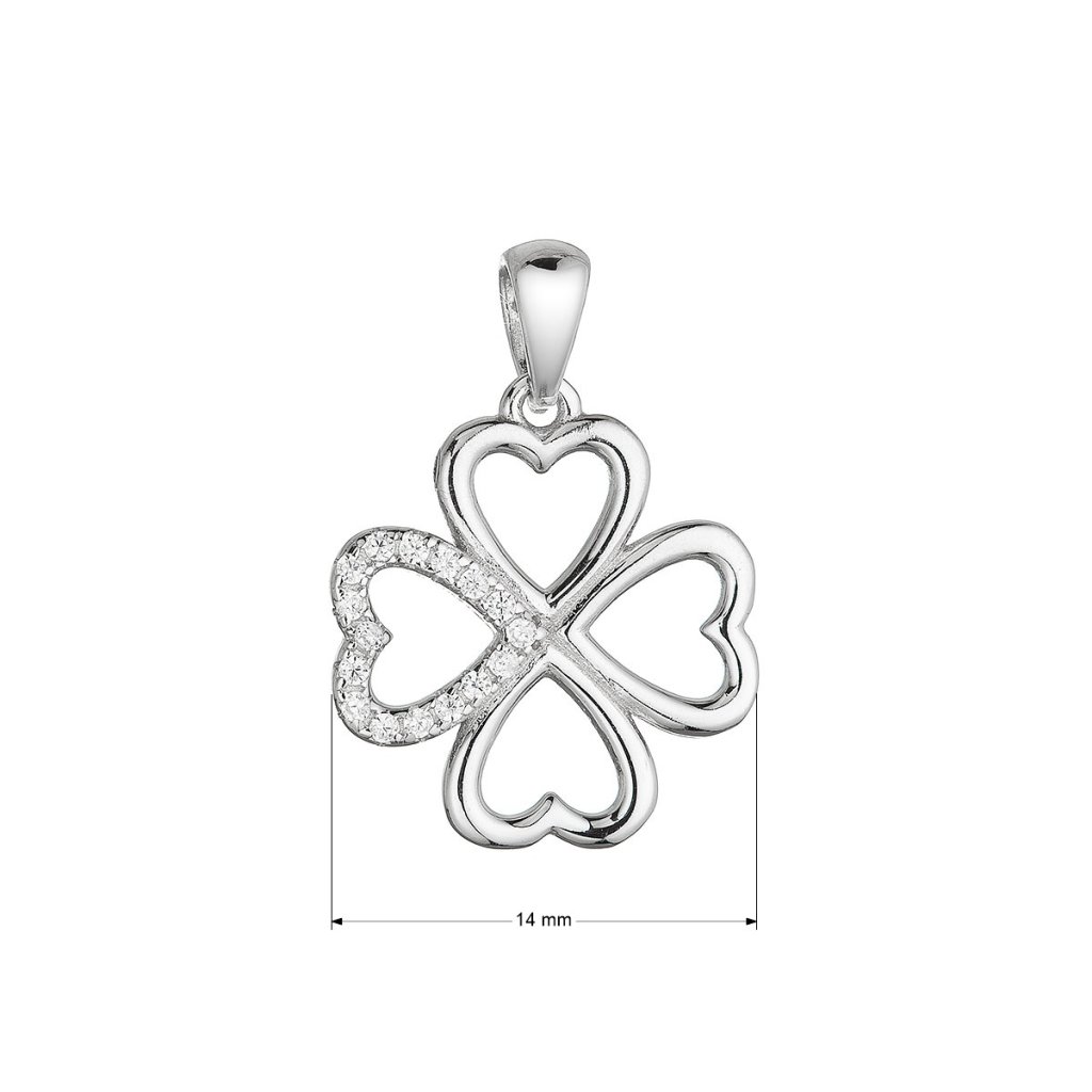 Dizajn štvorlístka je rafinovane zostavený zo štyroch prepojených srdiečok. Jeden z lístkov (srdiečok) je navyše vkusne vysadený trblietavými čírymi zirkónmi , ktoré dodávajú celému šperku iskru a punc luxusu. Toto detailné spracovanie podčiarkuje jedinečnosť a pôvab prívesku.
