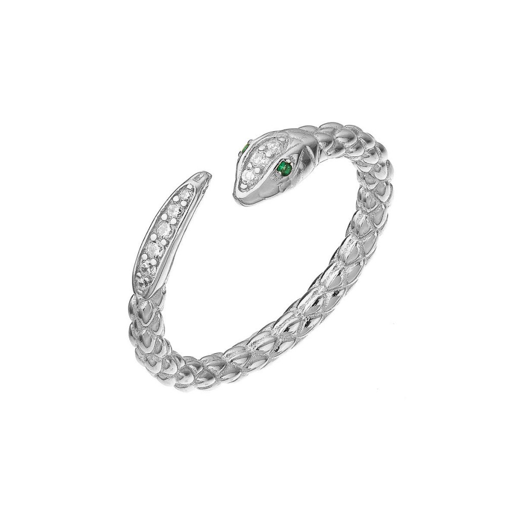 Tento obľúbený prsteň, ktorým je obtočený had okolo vášho prsta je vyrobený zo striebra o rýdzosti 925/1000 a je opatrený vrstvou ródia, ktorá šperk ochráni pred sčernením, zožltnutím alebo poškriabaním. Na mieste očí hada sú vsadené zelené zirkóny.
