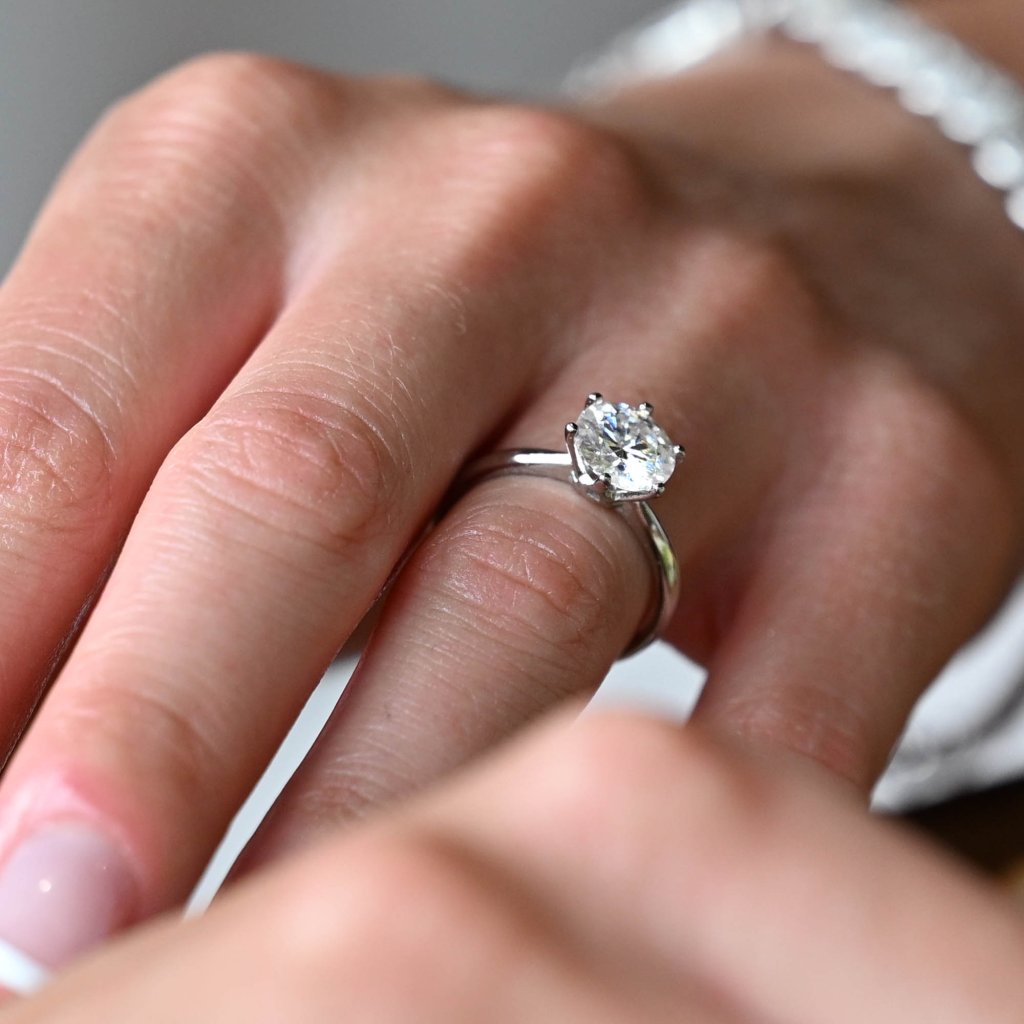 Luxusný prsteň s výrazným trblietavým moissanitom s priemerom 8 mm je stvorený pre tých, ktorí milujú decentné šperky s výrazným ligotom. Vďaka svojej čistej línii a brilantnému lesku je ideálny aj ako zásnubný prsteň , ktorý zaujme a poteší na prvý pohľad.