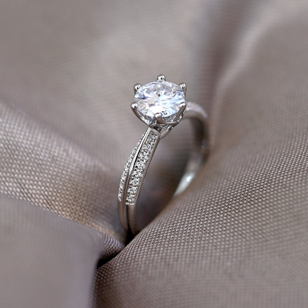 Nielen zásnubný prsteň zo striebra rýdzosti 925/1000 s precízne vsadenými drobnými zirkónmi a dominantným žiarivým pravým moissanitom v klasickom osadení je stelesnením luxusnej elegancie. Prepracovaný vzor na obrúčke dodáva prsteňa výnimočný charakter a luxusný nádych.