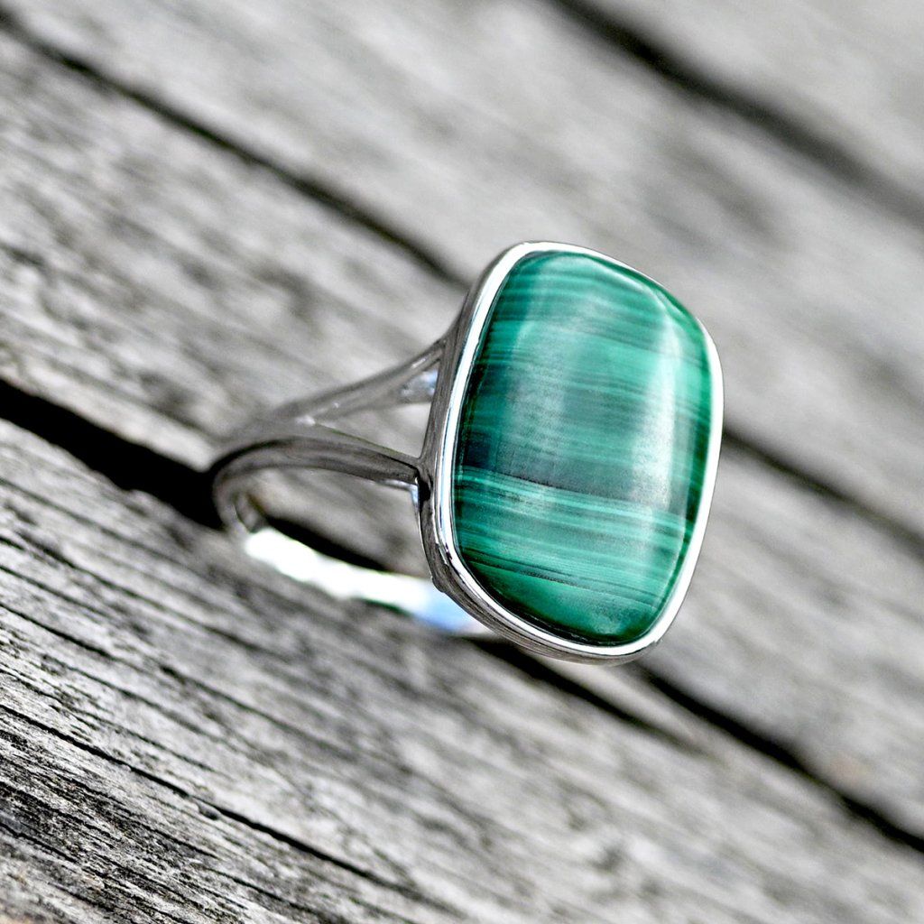 Prsteň je vyrobený z rýdzeho striebra tej najvyššej kvality 925/1000, dokonale chráneného luxusnej ródiovou úpravou , ktorá dodáva šperku neprekonateľný lesk a ochranu pred oxidáciou. Výrazný obdĺžnik je vyplnený vzácnym malachitom v sýtych, hlbokých odtieňoch zelenej, ktorý v sebe ukrýva mystickú energiu prírody. Každý kus tohto šperku je unikátny - malachit s charakteristickou zelenou kresbou pripomína tajomné krajiny a dych vyrážajúce prírodné scenérie.