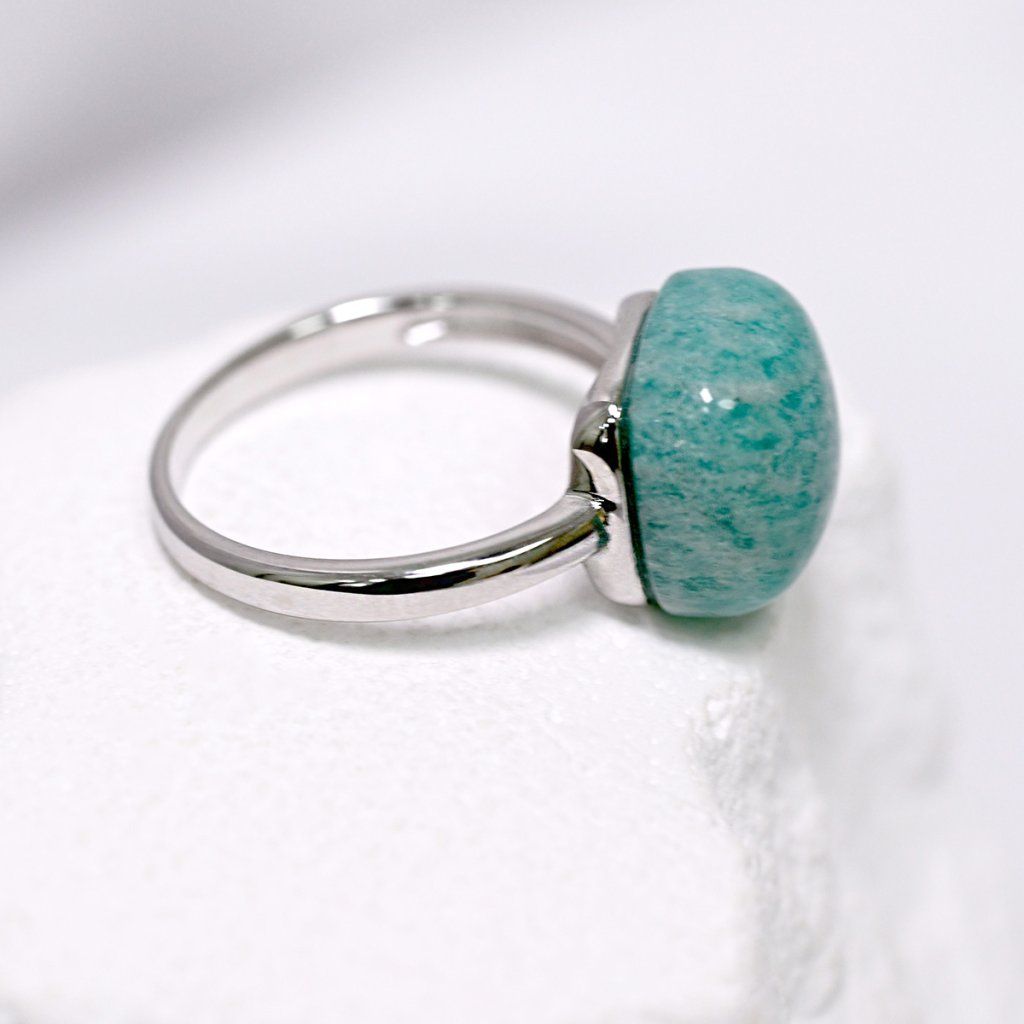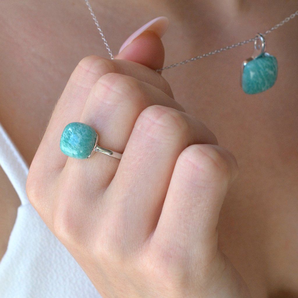 Prsteň je vyrobený zo striebra rýdzosti 925/1000 s ródiovou úpravou , ktorá dodáva šperku čistý a žiarivý lesk. V kombinácii so zeleným amazonitom precízne opracovaným do hladkého kamienku vzniká šperk, ktorý sa stáva nielen štýlovým doplnkom, ale aj osobným talizmanom.