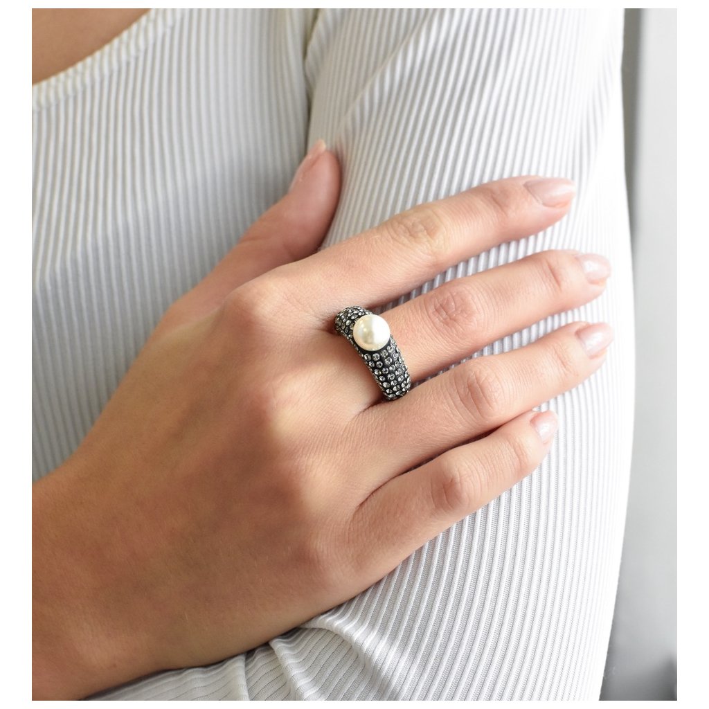 Prsteň je zdobený bielymi kryštálmi a veľkou bielou syntetickou perlou.