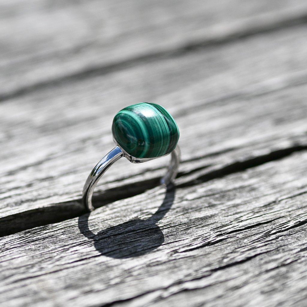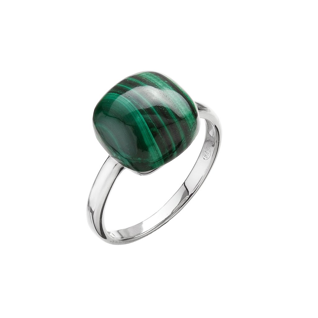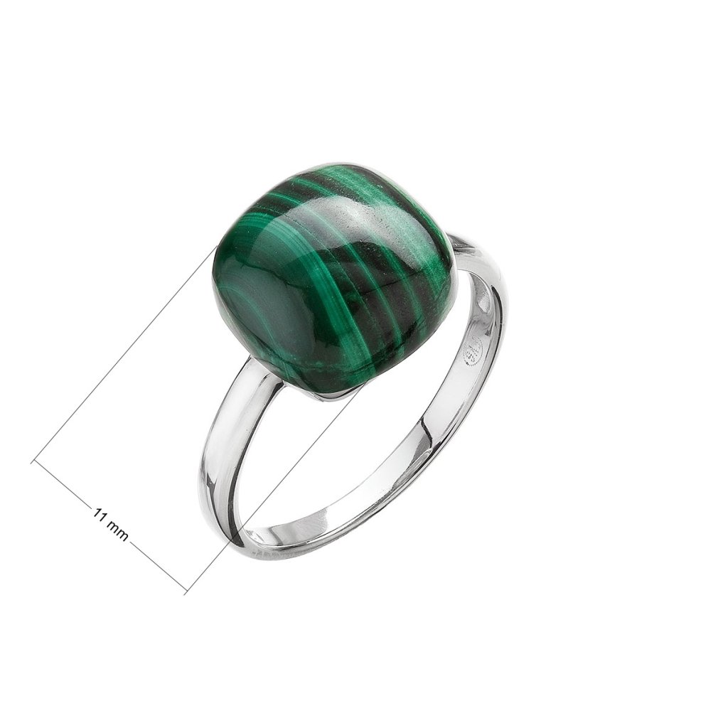 Prsteň je vyrobený zo striebra rýdzosti 925/1000 s ródiovou povrchovou úpravou, ktorá chráni šperk proti poškriabaniu a dodáva mu žiarivý lesk. Kameň malachit v tvare štvorca s charakteristickým zeleným žíhaním priťahuje pohľady a dodáva šperku jedinečný vzhľad. Malachit je zaoblený, hladký ako kamienok.
