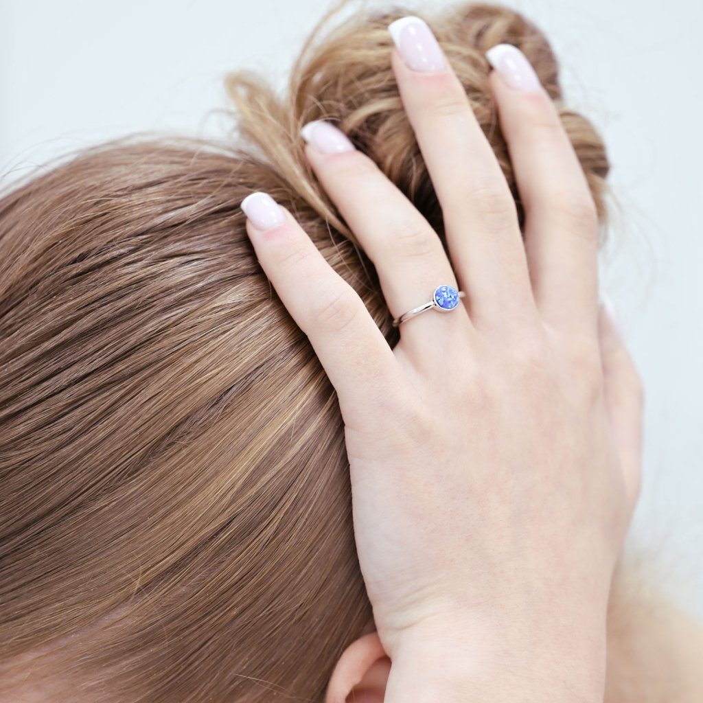 Zdobí ho okrúhly syntetický opál v modrej farbe.