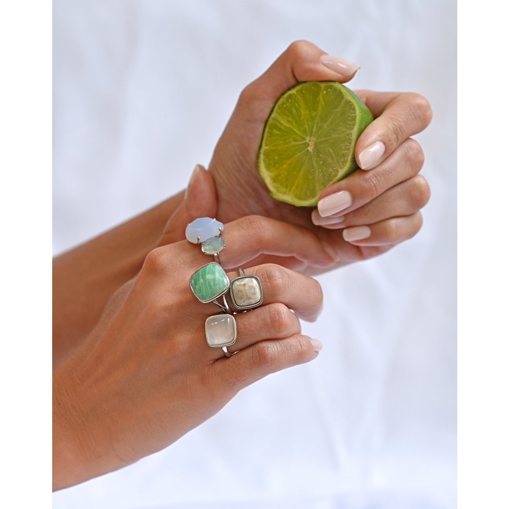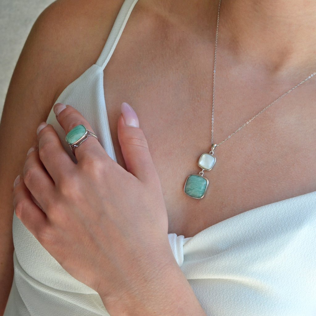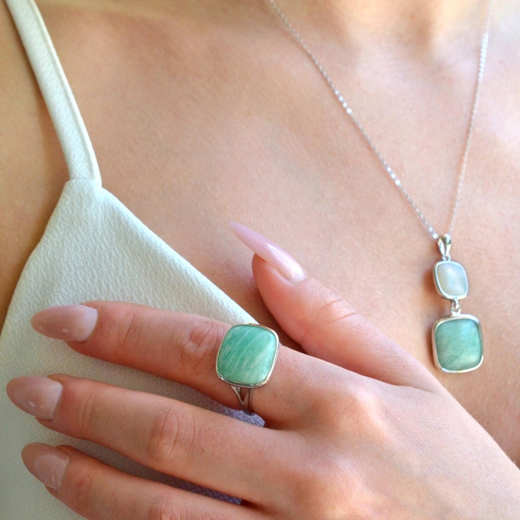 Prsteň je vyrobený zo striebra tej najvyššej kvality a ich povrch je dokonale chránený ródiovou úpravou. Ródium dodáva šperku neprekonateľný lesk a ochranu proti oxidácii. Výrazný štvorcový kameň amazonit v zelenkavých tónoch, ohraničený striebrom vytvára luxusný dojem. Ukrýva energiu pokoja a vnútornej sily.
