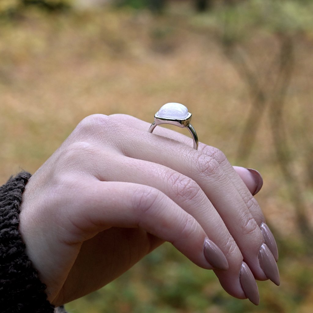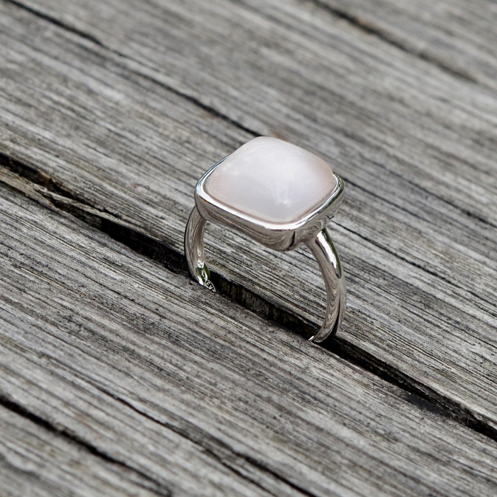 Prsteň je vyrobený z rýdzeho striebra 925/1000 s povrchovou úpravou ródiom , ktorá zaisťuje mimoriadny lesk a ochranu pred oxidáciou. Dizajn tvorí jemný strieborný štvorček, ktorý je vyplnený pravým ruženínom v nežne ružovej farbe. Vytvára jedinečnú choreografiu svetla a tieňa - vnútornú harmóniu a silu.