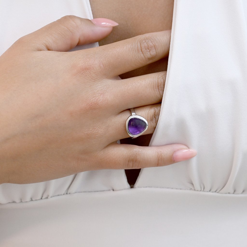 Očarujúce strieborný trojuholníkový prsteň s pravým ametystom – tajomstvo vnútornej sily a duchovna.