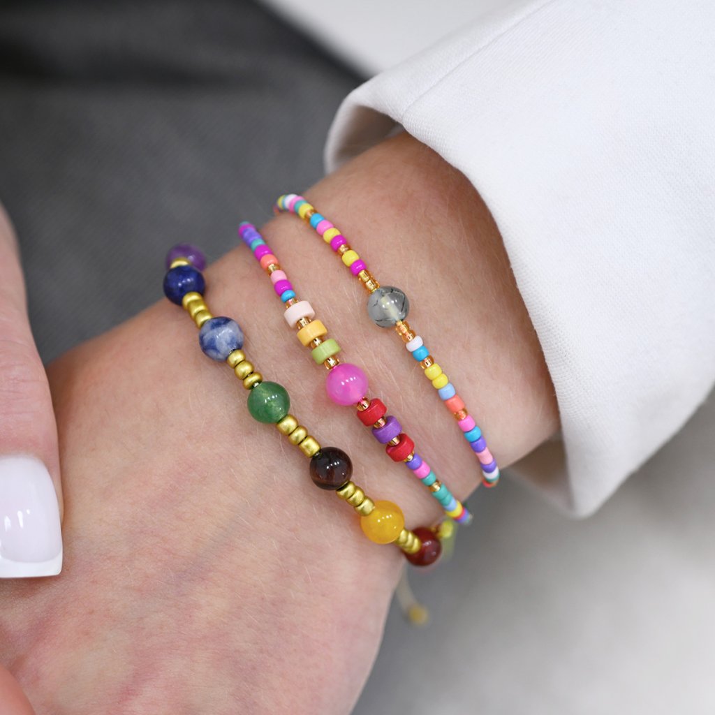 Sada 3 farebných náramkov - tri originálne kúsky, ktoré spolu nádherne ladia. Každý náramok je vzhľadovo iný, môžete ich nosiť dohromady pre výrazný look alebo jednotlivo podľa nálady a outfitu. Ideálny doplnok, ktorý oživí každý outfit.