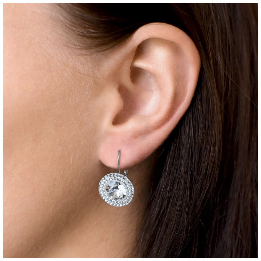 Ozdobte sa nádherne zdobenými visiacimi náušnicami a príveskom v rovnakom dizajne zo súpravy 39107.1Súprava šperkov 39107.1 obsahuje okrúhle visiace náušnice a prívesok v rovnakej podobe. Šperky sú zdobené veľkým okrúhlym Swarovski kryštálom v bielej farbe, ktorý je navyše lemovaný dvoma radmi menších bielych kryštálov Swarovski. Šperky zo súpravy 39107.1 sú vyrobené zo striebra rýdzosti 925/1000 vrátane povrchovej úpravy ródiom. Ródium chráni šperk proti sčerneniu, zožltnutiu i poškriabaniu. Náušnice majú zapínanie na klapku . Keďže šperky neobsahujú žiadny prídavok niklu , môžu ich bez obáv nosiť aj alergici.