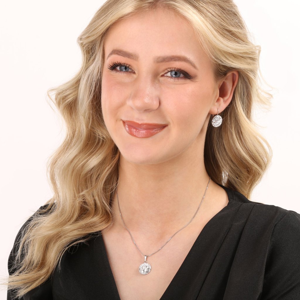 Blysknite sa bohato zdobenými šperkami zo súpravy 39117.1 a rozžiarte nimi svoj každodenný outfit!Súprava šperkov 39117.1 obsahuje okrúhle visiace náušnice a prívesok v rovnakom štýle. Šperky sú vyrobené zo striebra rýdzosti 925/1000, ktoré prešlo povrchovou úpravou ródiom. Ródium chráni šperk proti sčerneniu, zožltnutiu i poškriabaniu. Prívesok aj náušnice sú bohato zdobené bielymi trblietavými Swarovski kryštálmi. Náušnice majú zapínanie na klapku . Keďže šperky neobsahujú žiadny prídavok niklu , môžu ich bez obáv nosiť aj alergici.