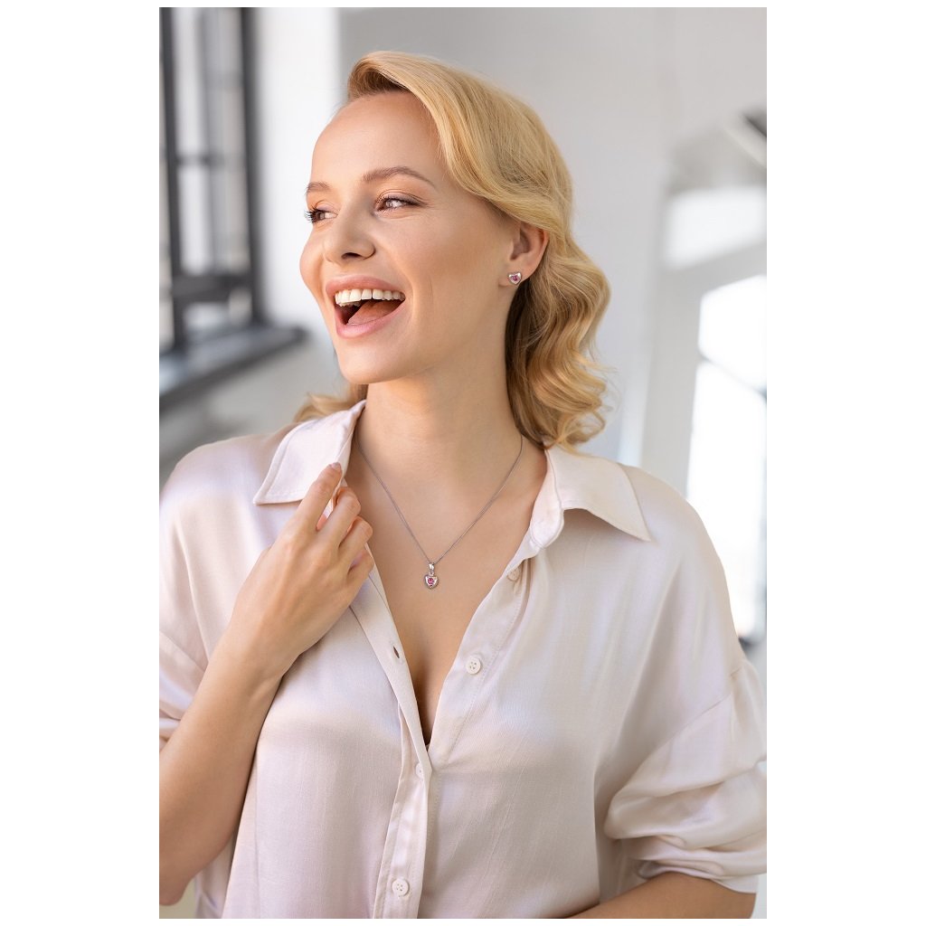 Originálna sada šperkov v tvare srdiečka hravo oživí každý outfit.Súprava 39176.3 obsahuje náušnice a prívesok. Šperky sú vyrobené zo striebra rýdzosti 925/1000, ktoré prešlo povrchovou úpravou ródiom. Ródium chráni šperk proti sčerneniu, zožltnutiu i poškriabaniu. Prívesok aj náušnice sú zdobené ružovými Swarovski kryštálmi. Náušnice sa zapínajú na puzetku. Keďže šperky neobsahujú žiadny prídavok niklu , môžu ich bez obáv nosiť aj alergici.