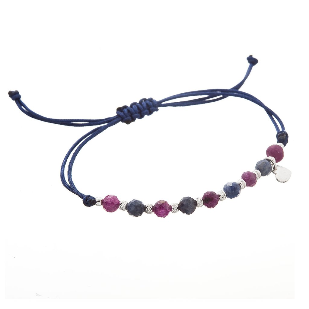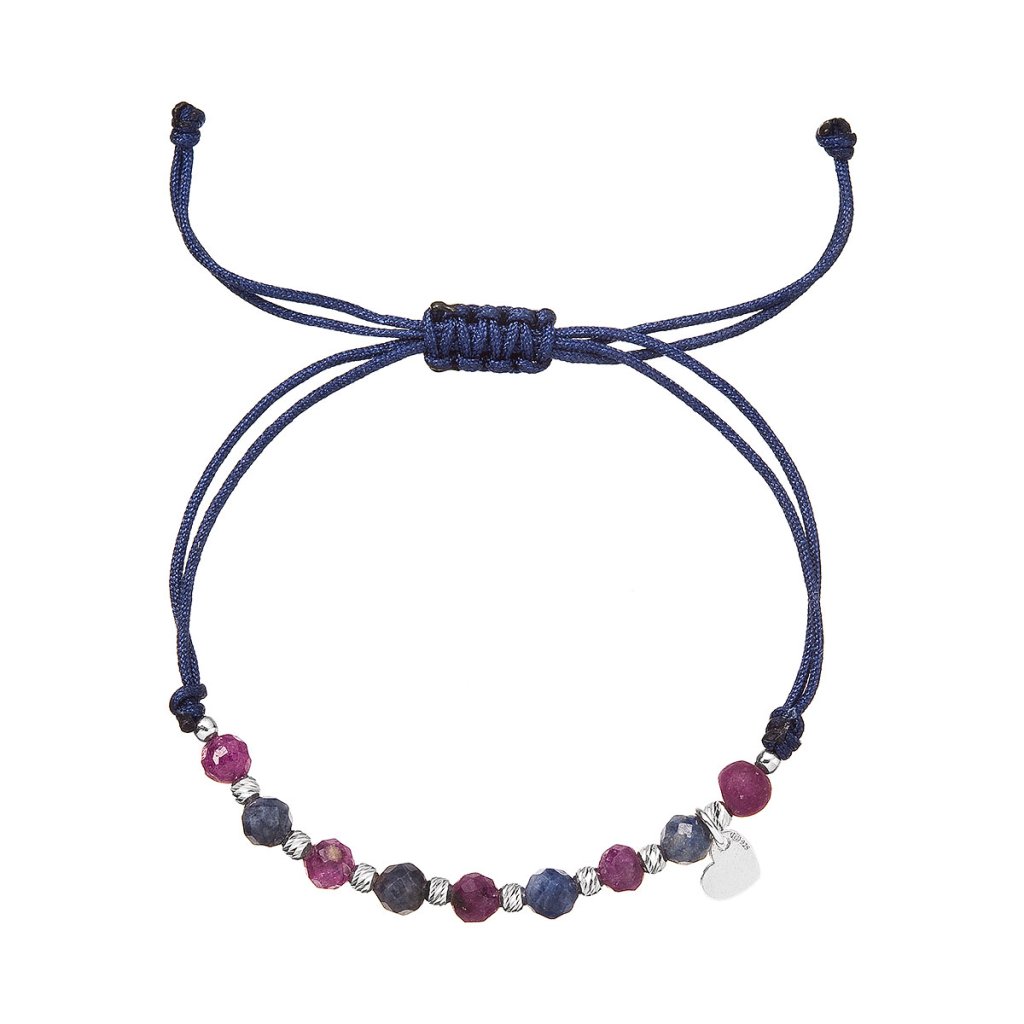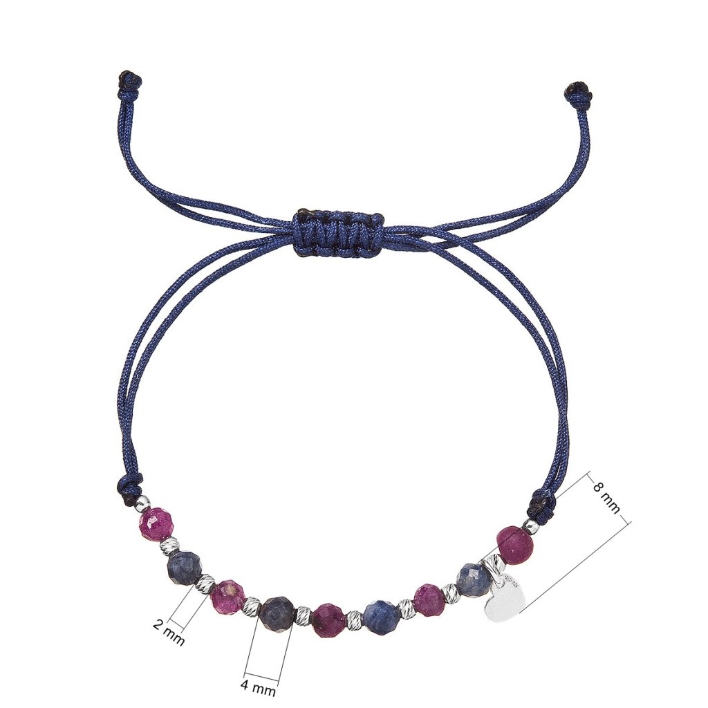 Je vyrobený z hladkej pevnej šnúrky a korálok z rubínu a zafíru, ktoré sa striedajú so striebornými guličkami, navyše je náramok prizdobený príveskom tvaru srdiečka.