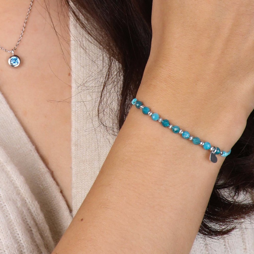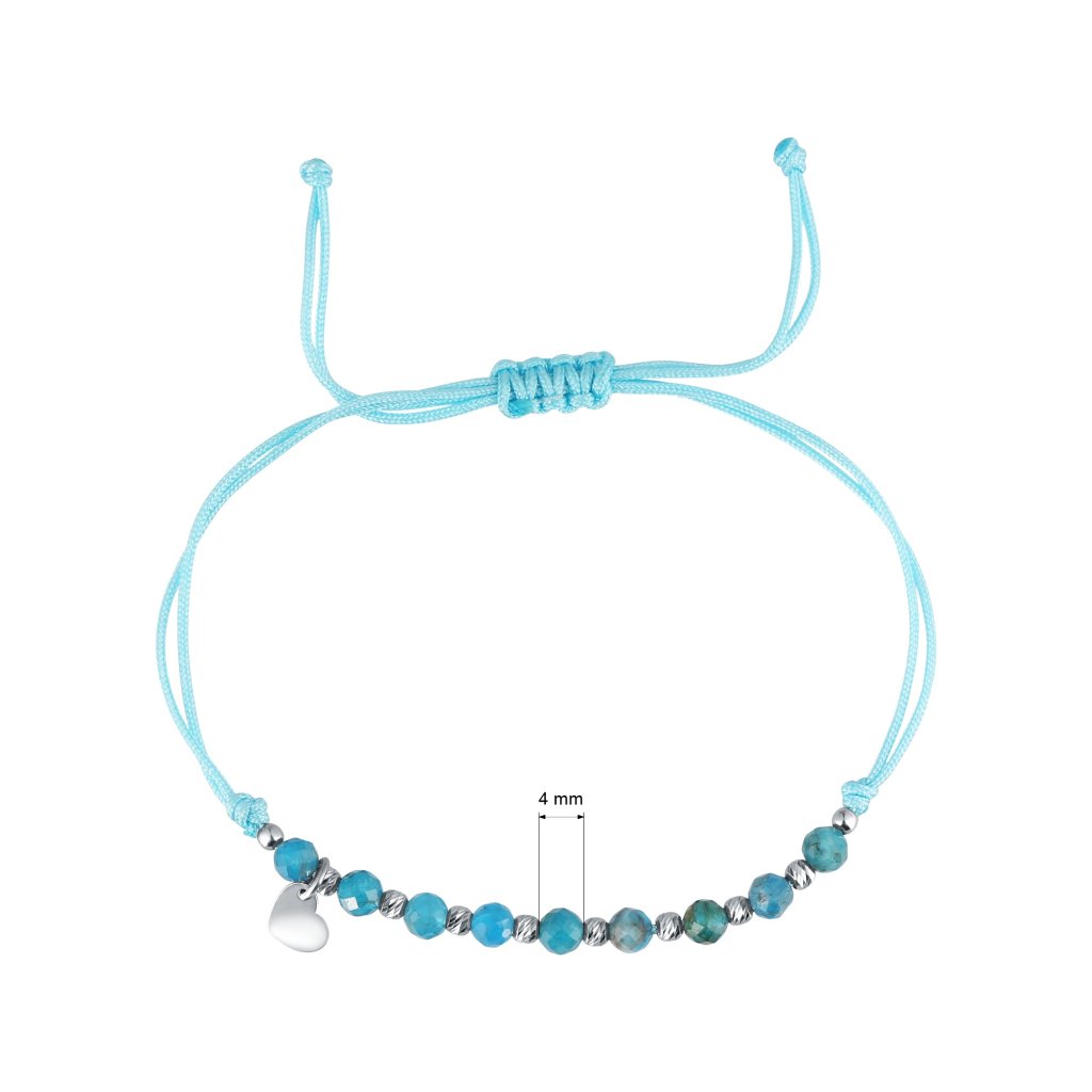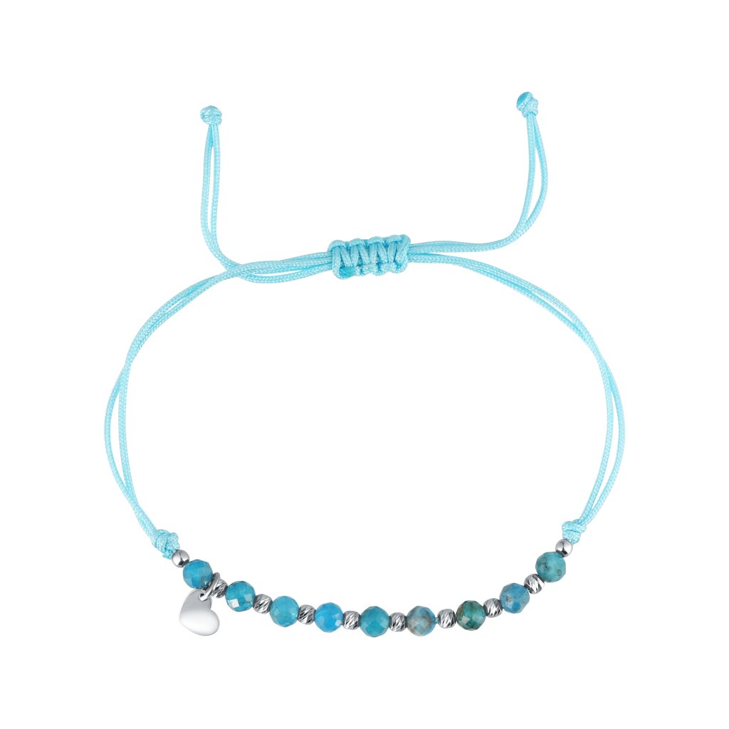 Náramok s prírodnými fazetovanými minerálnymi kameňmi vám prinesie krásny módny doplnok a taktiež podporí Vašu duševnú a fyzickú rovnováhu.Je vyrobený z hladkej pevnej šnúrky a korálok z apatitu, ktoré sa striedajú so striebornými guličkami, navyše je prizdobený príveskom tvaru srdiečka.