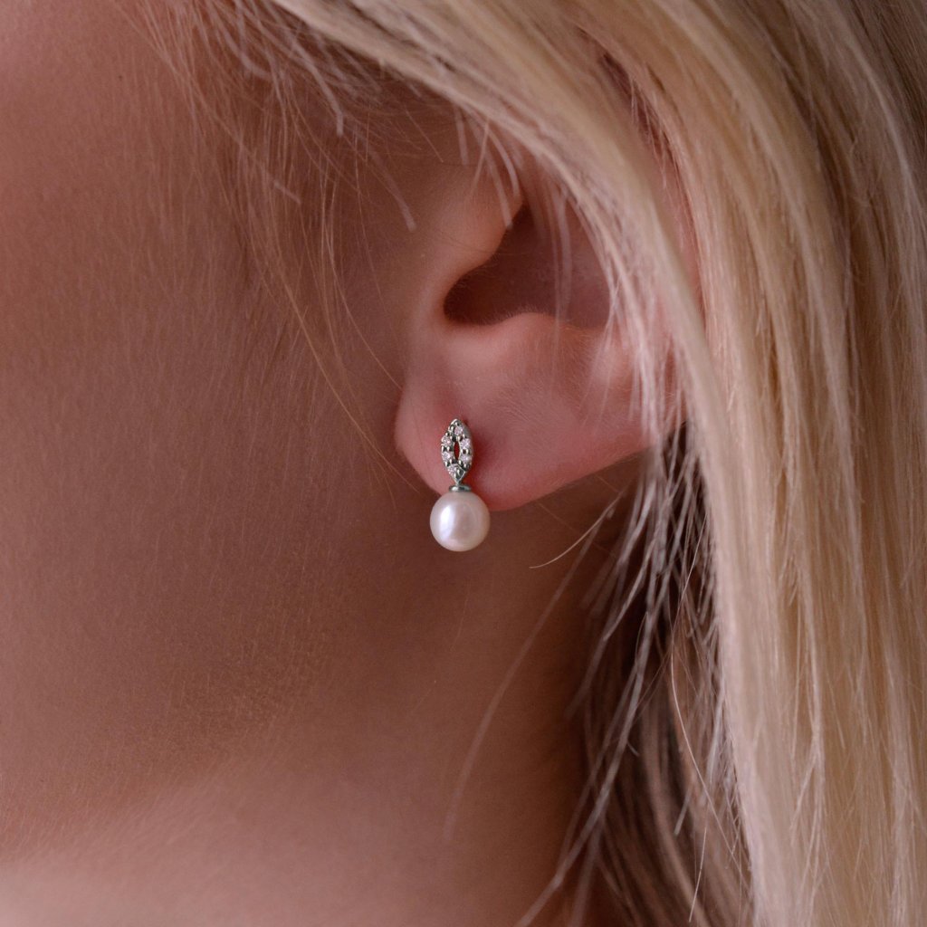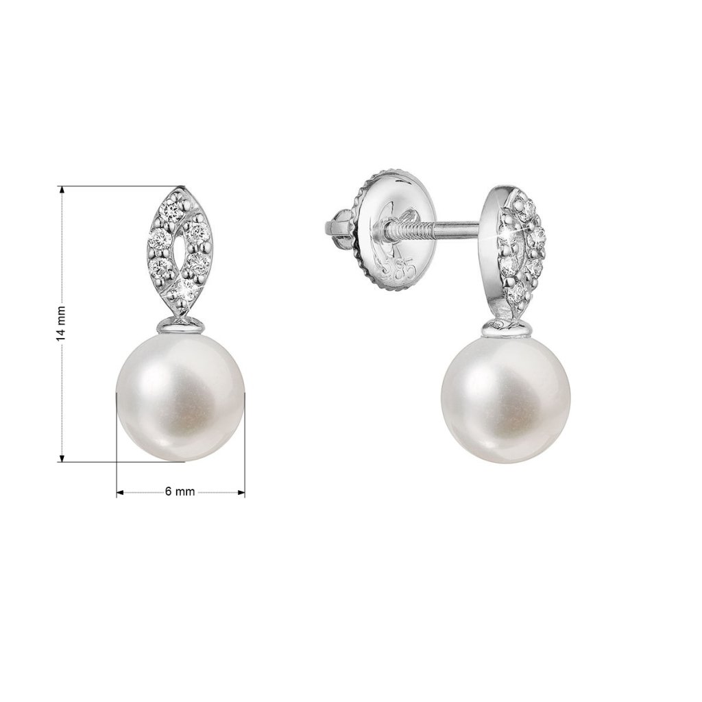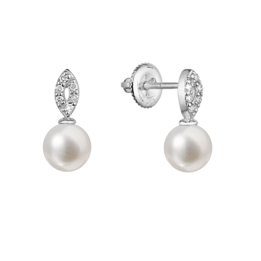 Zlaté náušnice bohato vysadené briliantmi s bielou riečnou perlou.Na náušnice 81PB00045 bolo použité 14 karátové biele zlato s rýdzosťou 585/1000 a pravé kultivované sladkovodné riečne perly s mnohými briliantmi. Perly o veľkosti 6 mm sa môžu pochváliť najvyššou kvalitou AAA . Celkový počet briliantov je 12 ks o 0,108 ct.