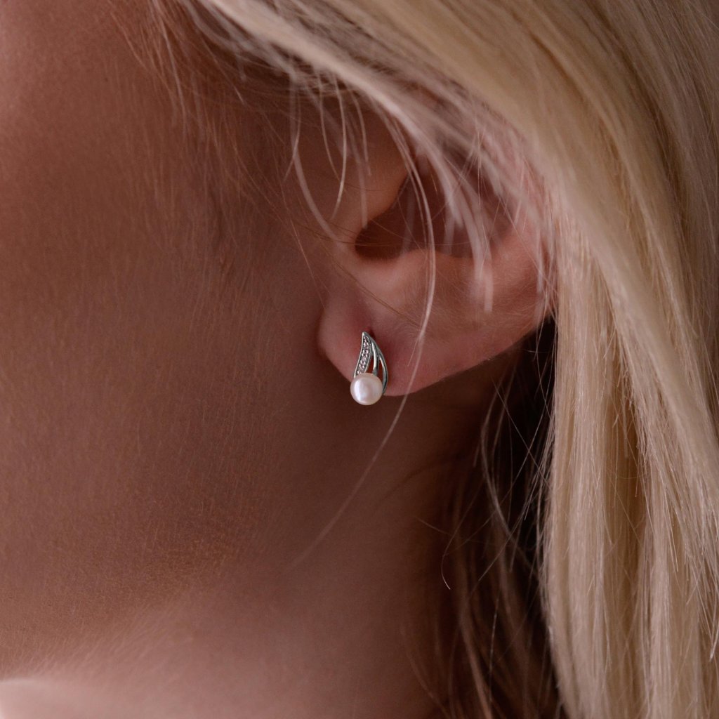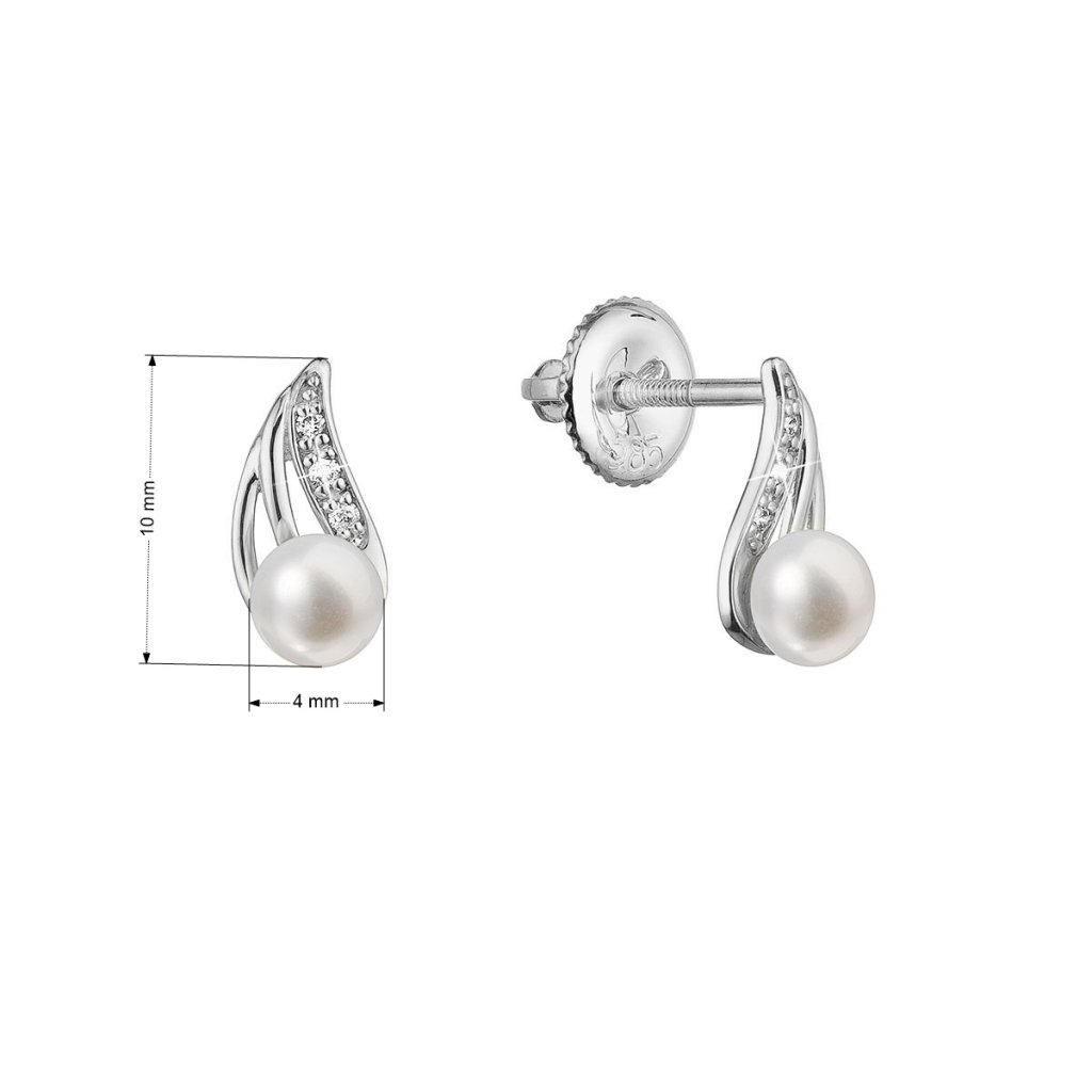 Perlička ako stekajúca kvapôčka z lístočka s trblietavými kvapkami rosy z briliantov, tak pôsobia zlaté náušnice.Na náušnice 81PB00056 bolo použité 14 karátové biele zlato s rýdzosťou 585/1000 a pravé kultivované sladkovodné riečne perly spolu s briliantmi. Perly o veľkosti 4 mm sa môžu pochváliť najvyššou kvalitou AAA . Briliantov je celkom 6 ks o 0,030 ct.