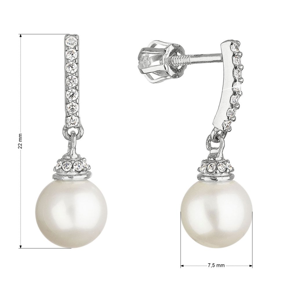 Náušnice 81PZ00021 sú vyrobené zo 14 karátového bieleho zlata s rýdzosťou 585/1000 a zdobia ich okrúhle biele riečne perly tej najvyššej kvality AAA . Šírka perličky je 7,5-8 mm. Náušnice navyše zdobia nad sebou vsadené zirkóny, ktoré svojim ligotom umocňujú krásu. Náušnice majú zapínanie na skrutku.