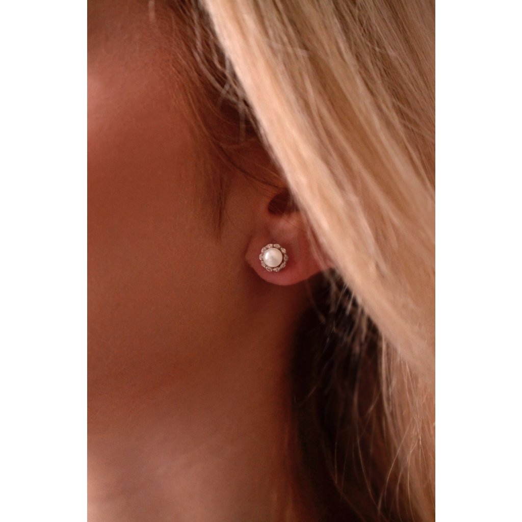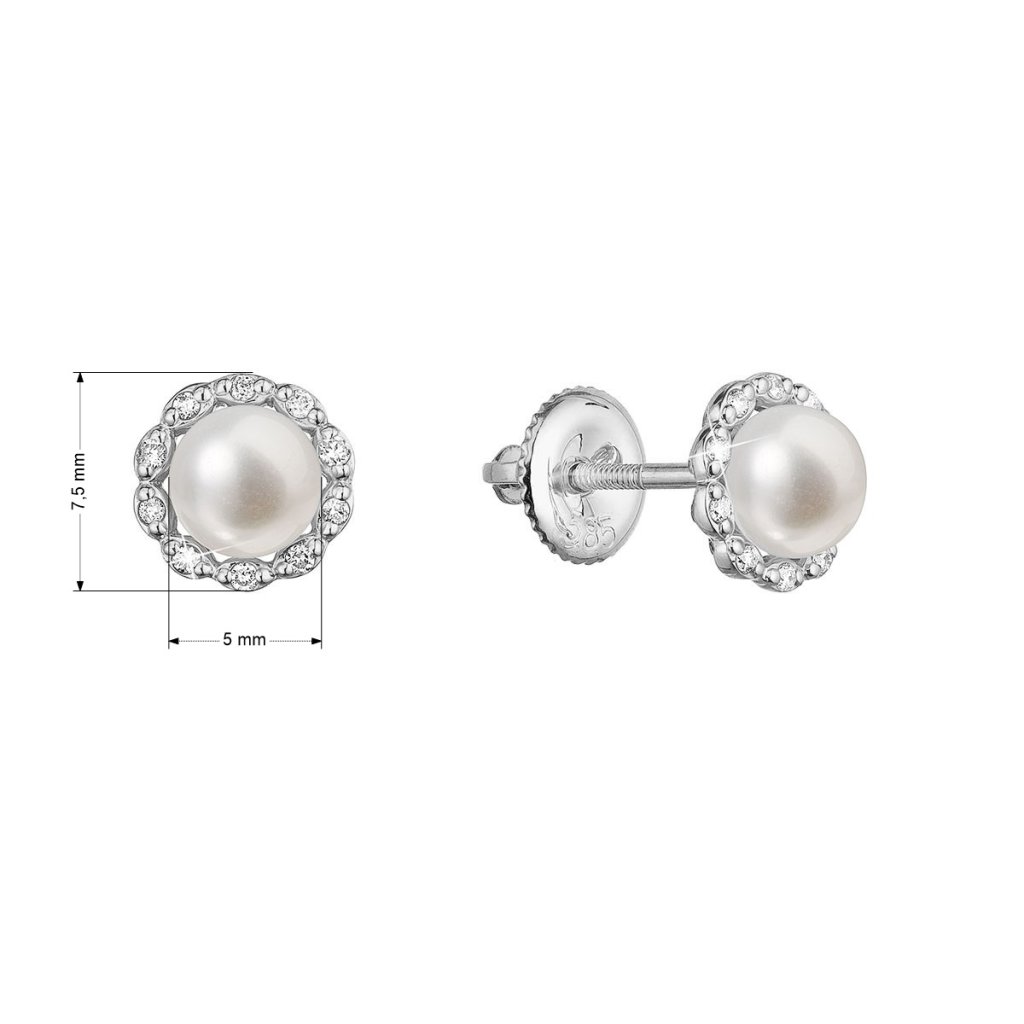 Náušnice v tvare kvietky z bieleho zlata sú žiarivým a romantickým šperkom , ktorý spája krásu bieleho zlata s leskom briliantov a prírodnou eleganciou bielej riečnej perly.Na náušnice 81PB00041 bolo použité 14 karátové biele zlato s rýdzosťou 585/1000 a pravé kultivované sladkovodné riečne perly. Perly s priemerom 5 mm sa môžu pochváliť najvyššou kvalitou AAA a tvoria stred ktetinky. Okvetné lístočky sú z malých